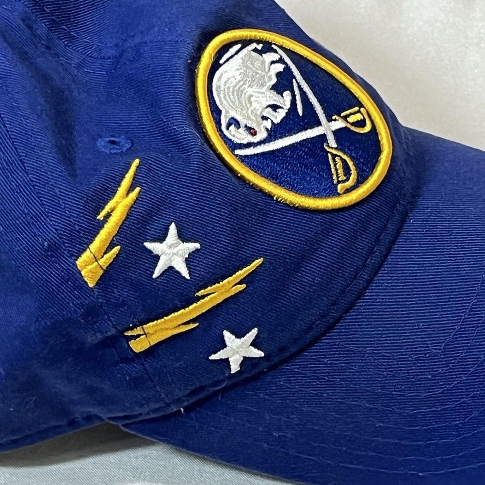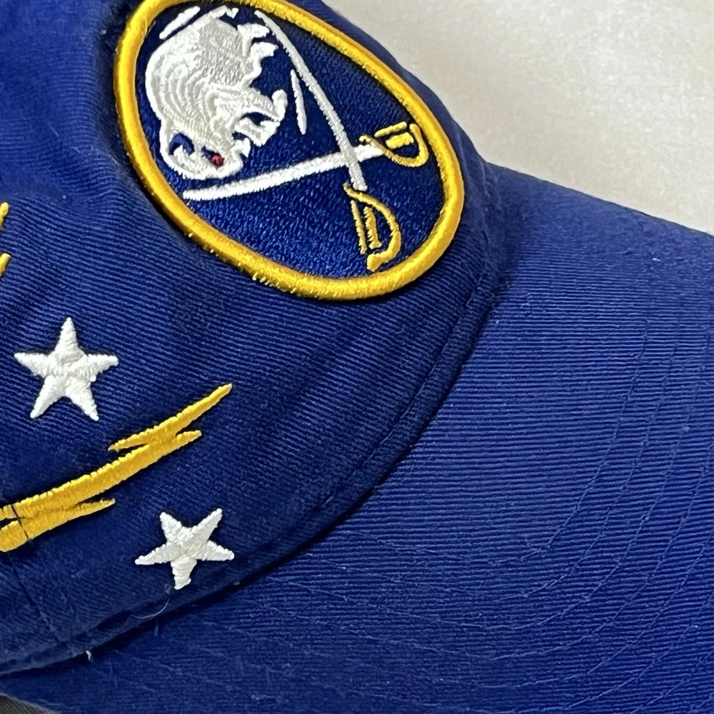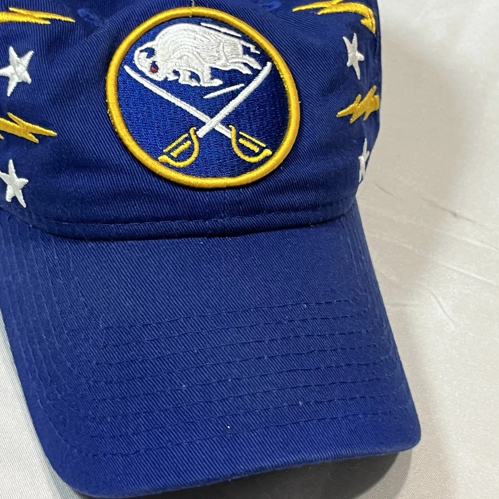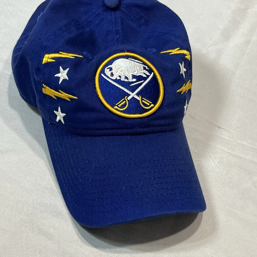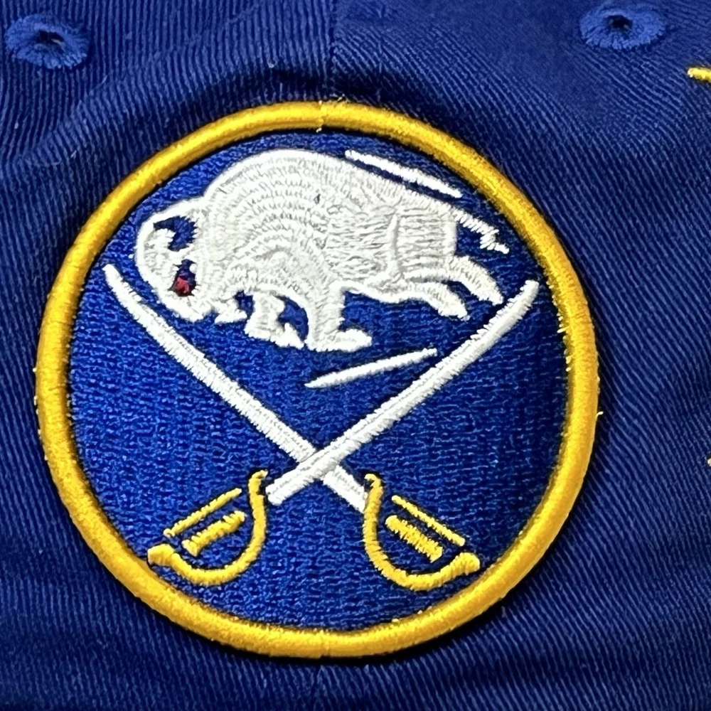 The Buffalo Sabres Hat by New Era is an officially licensed retro cap featuring the team's iconic colors and logo. This adjustable strap back cap is perfect for hockey fans looking to showcase their support for the Buffalo Sabres during the regular NHL season. Made in China, this one-size-fits-all cap is a stylish accessory for fans of the team and the sport of hockey.233.π