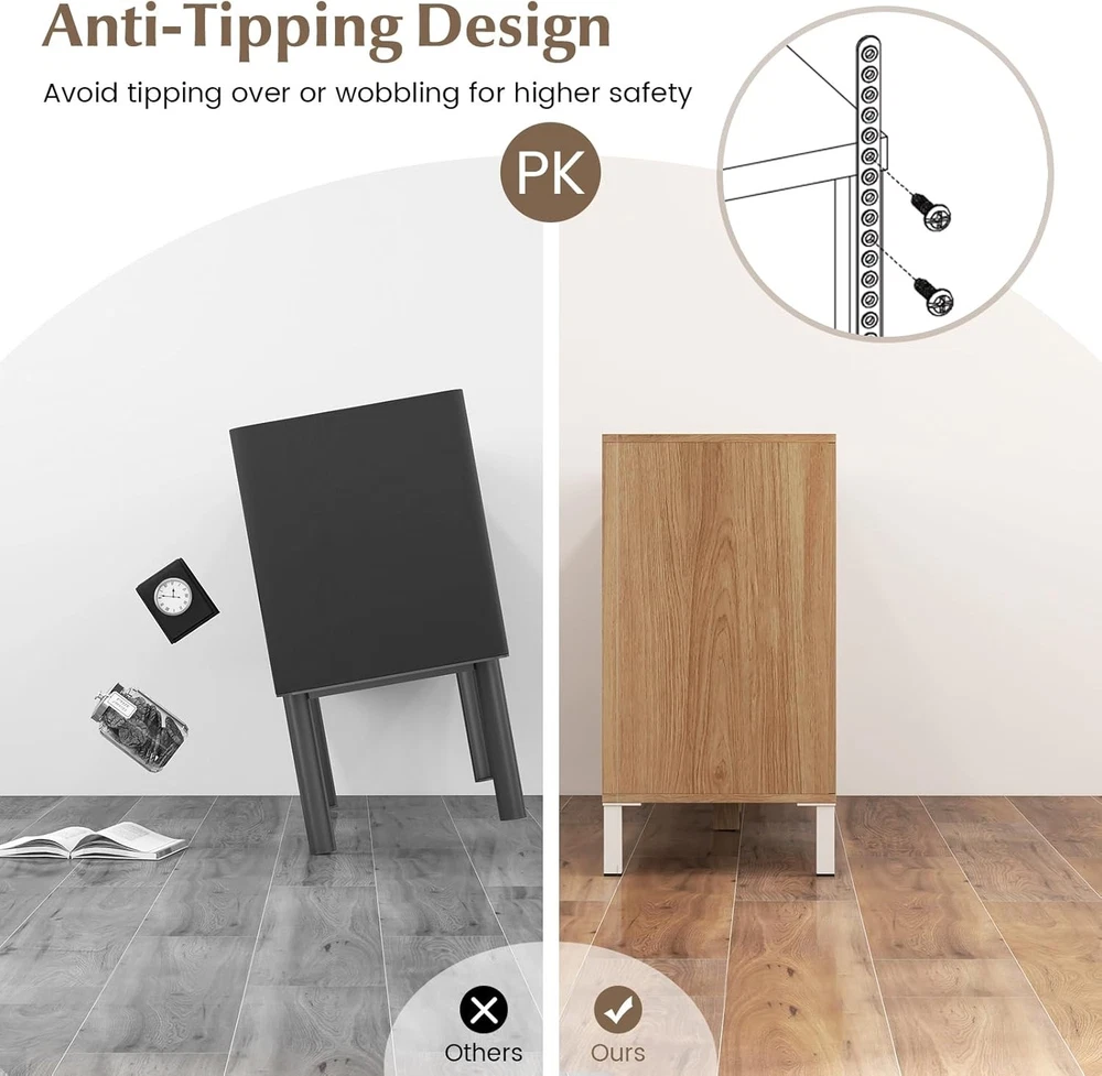 Product Description Description: This modern buffet sideboard is perfect for organizing essentials and keeping your space clutter-free. With a spacious countertop, 4 open compartments, and a 2-door cabinet, this cabinet caters to all your storage needs. And the 5-level adjustable design of the open shelves suits for items of different sizes. The sleek push-to-open design allows you to open and close the door without handle, which is more convenient. Moreover, the sturdy leg support as well as anti-tipping fitting ensure durability and safety. Whether you’re using it as a chic coffee bar cabinet, an elegant entryway organizer, or a classic dining room buffet, this sideboard is your ideal solution for sophisticated and orderly living. Features: Ample storage space for kitchenware, decorations, potted plants, books and so on 5-position adjustable shelves for items of different sizes Push-to-open design of the cabinet door for more convenience Made of high-grade material for long-term use 4 metal legs and 2 extra middle legs for strong support Anti-toppling device highly enhances safety Perfect for kitchen, living room, dining room, etc. With 2 boxes and you may receive them at different time Specifications: Color: Natural + White Material: MDF, Metal, Engineered Wood Overall Dimension: 63” x 16” x 29.5” (L x W x H) Dimension of Upper Open Shelf: 14.5” x 14.5” x 10.5” (L x W x H) Dimension of Bottom Open Shelf: 14.5” x 14.5” x 11”(L x W x H) Dimension of Inner Shelf: 31” x 14.5” x 11.5”(L x W x H) Clearance from Ground: 5” Net Weight: 105 lbs Package Includes: 1 x Buffet Sideboard 1 x Instruction On Aug 14, 2025 at 21:36:30 PDT, seller added the following information: