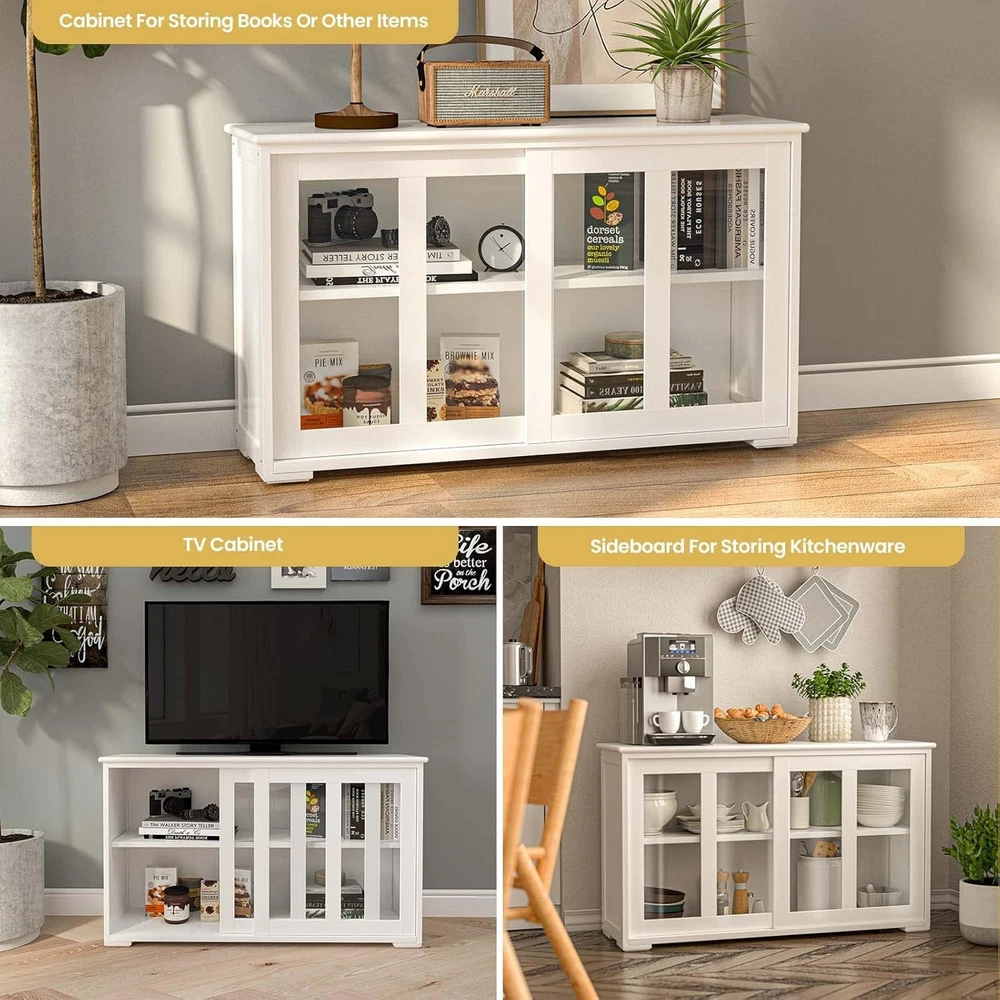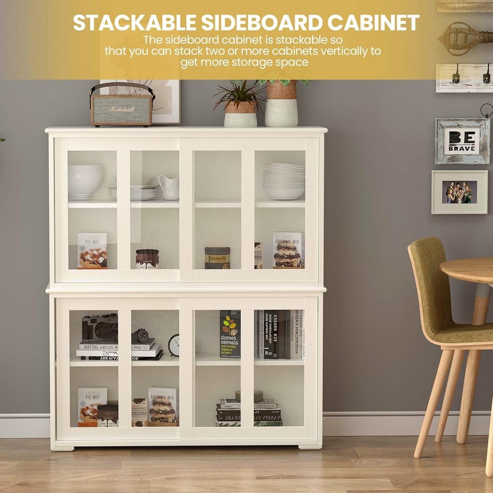 Product Description Buffet Cabinet with Sliding Slat Doors and Adjustable Shelf WELL - Instead of using a cardboard back, the back is actually 1/4" press board that matched the wood of the rest of the cabinet. The inside shelf was painted on all 4 edges and there were no raw sides. SLIDING SLAT DOOR - The doors were on rolling plastic wheels that were already attached to the doors but with a flick of a switch inside of each of the doors you are able to take the doors out of the cabinet. They roll very smoothly thanks both to the nylon wheel and the felt lining inside of the tracks. STORAGE SPACE - This cabinet help with some small appliance storage, cookie cutter storage, hand mixer, bundt pan, and basically anything that you use for baking on a semi regular basis that tends to get lost if it goes into a large cupboard. Sideboards And Buffets With Storage Nafort : Natural gift of comfort home. Nafort Kitchen Storage Sideboard - High quality MDF material, solid and durable. - Simple and fashionable design, suitable for dining room, kitchen, livingroom, etc. - Height-adjustable shelf meet more needs. Sliding Doors with Glass Sliding doors are very smooth to use The clear glass design on the 2 sliding doors allows you to quickly find the items you need Adjustable Shelf The shelf is adjustable in 3 heights The height of the shelf can be adjusted according to the stored items Moisture-proof Legs Cabinet is supported by short legs, not directly on the floor Short legs provide greater support and are effective against moisture Stackable Design The sideboard cabinet is stackable so that you can stack two or more cabinets vertically to get more storage space. Storage Space Double storage space with sliding doors Ideal for storing kitchen items such as dishes and glasses, also works as a bookshelf Product Size Overall size: 42.0”L*13.0”W*23.5”H NOTE: Please pay attention to the size of the product before purchasing! Sideboard And Buffet for Kitchen & Dining Room Specifications: Material: MDF Color: Cream White Overall dimension: 42.0”L*13.0”W*23.5”H Adjustable shelf weight capacity: 44 lbs Product weight: 45.4 lbs On Aug 11, 2025 at 00:00:25 PDT, seller added the following information: