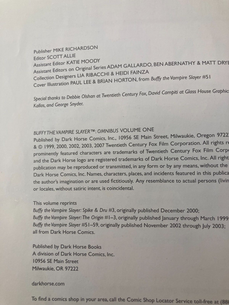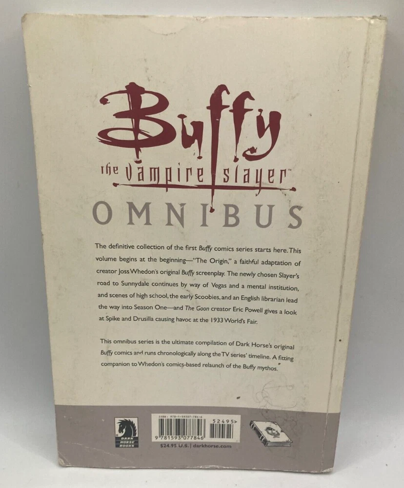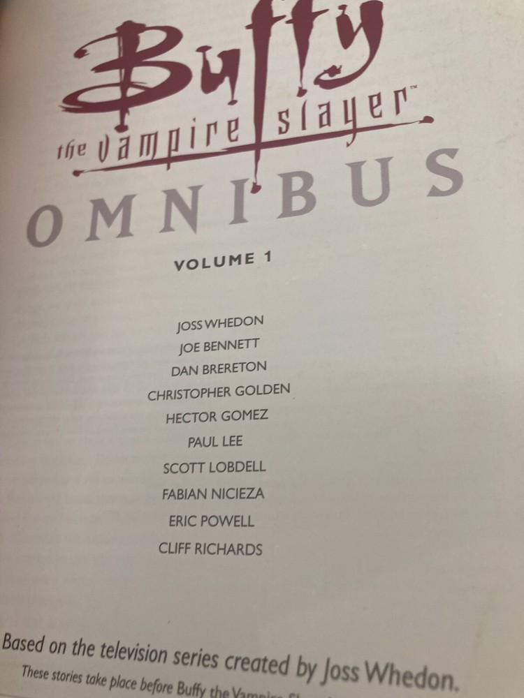 Buffy The Vampire Slayer Omnibus Volume 1 Trade Paperback Dark Horse 2007. GC. Cover is creased. Photo 3. Slightly dog-eared. Photo 4.