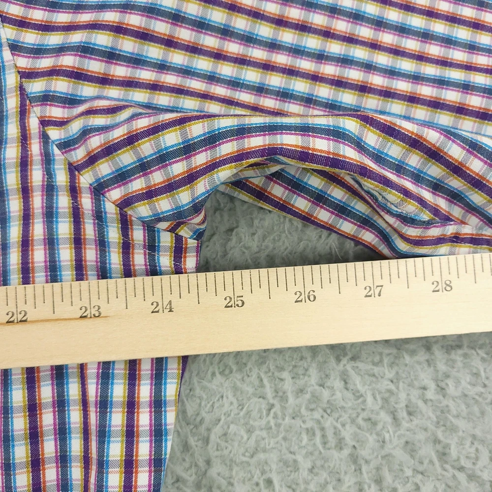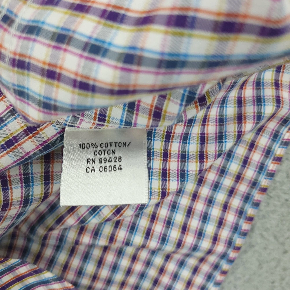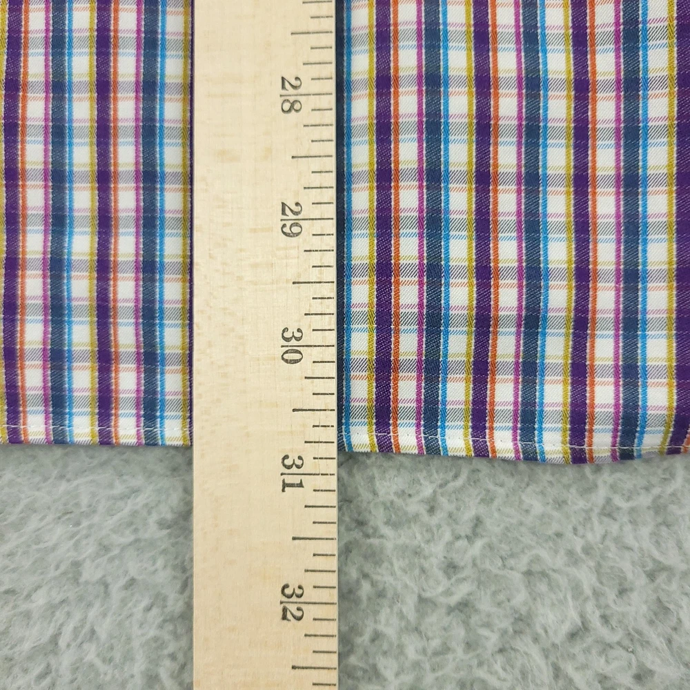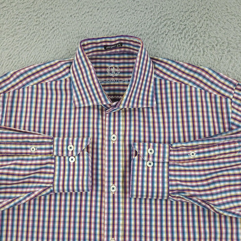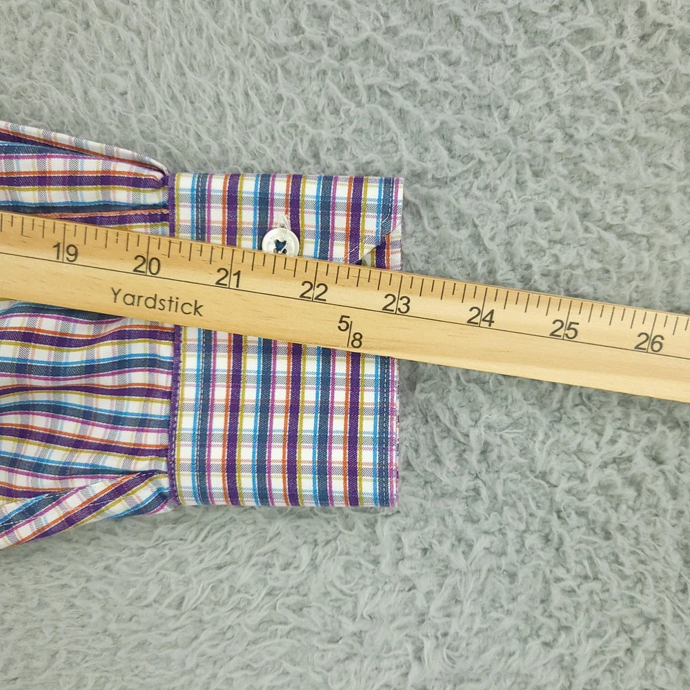 Bugatchi Uomo Dress Shirt Mens 16.5 Multicolor Check Cotton Slim Long Sleeve Brand: Bugatchi Uomo. Style: Mens long sleeve button front dress shirt with a spread collar, single chest pocket, and barrel cuffs. Color: White base with multicolor mini check pattern in blue, red, yellow, and purple. Size on tag: Mens 16.5 neck Material: 100% cotton woven fabric. Features: Slim tailored silhouette suitable for business or office wear, structured spread collar, full button front with contrast-stitched buttons, left chest pocket with pattern-matched construction, long sleeves with two-button adjustable barrel cuffs and sleeve plackets, curved shirttail hem designed to be worn tucked, interior Bugatchi crest and logo embroidery at back neck, interior care label indicating 100% cotton fabric with RN 99428 and CA 00604. Measurements are included in the photos, compare measurements with your item to ensure proper fit. Items are added daily click here to Visit My Store Combined shipping for US customers is 1.99 for each additional item Items are cleaned per eBay standards & policies