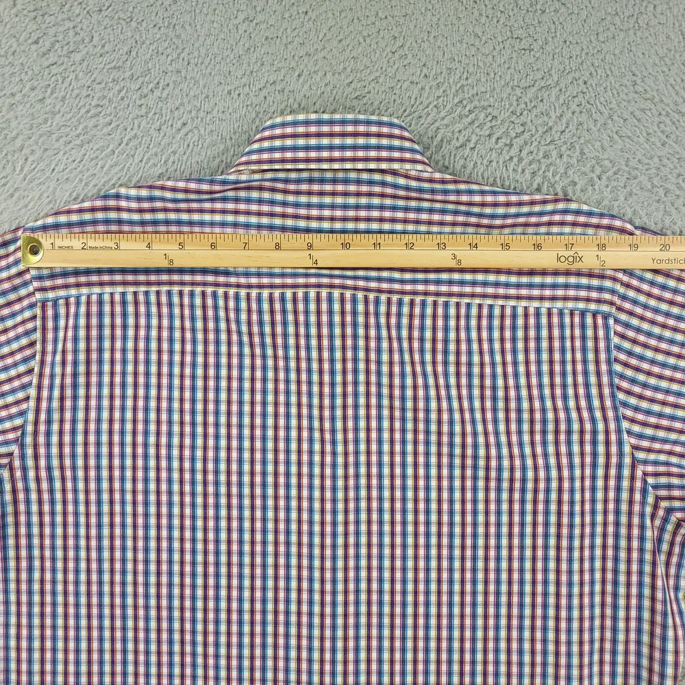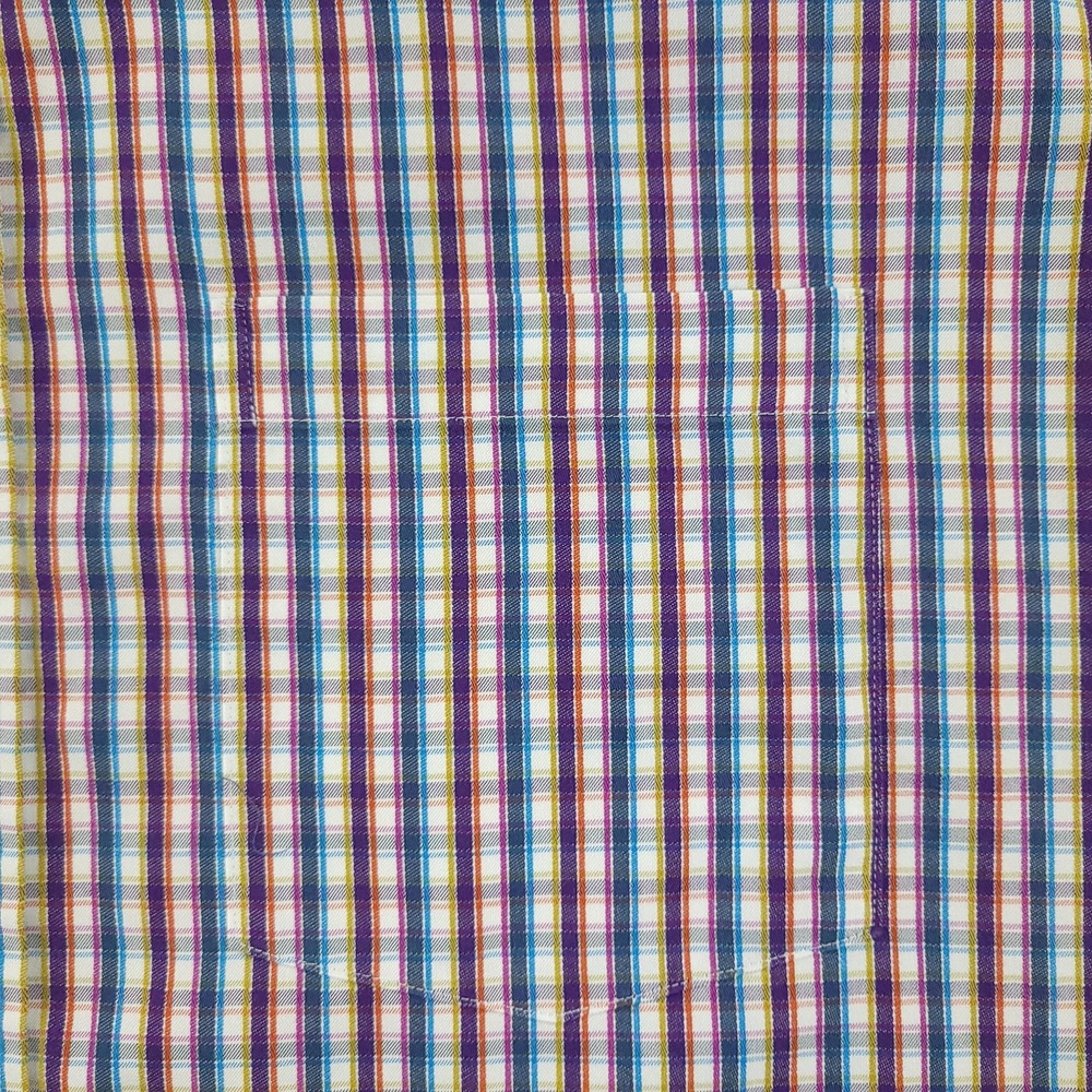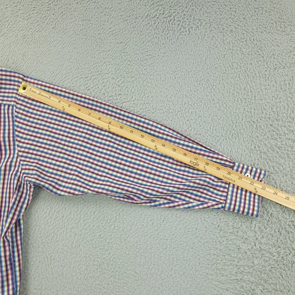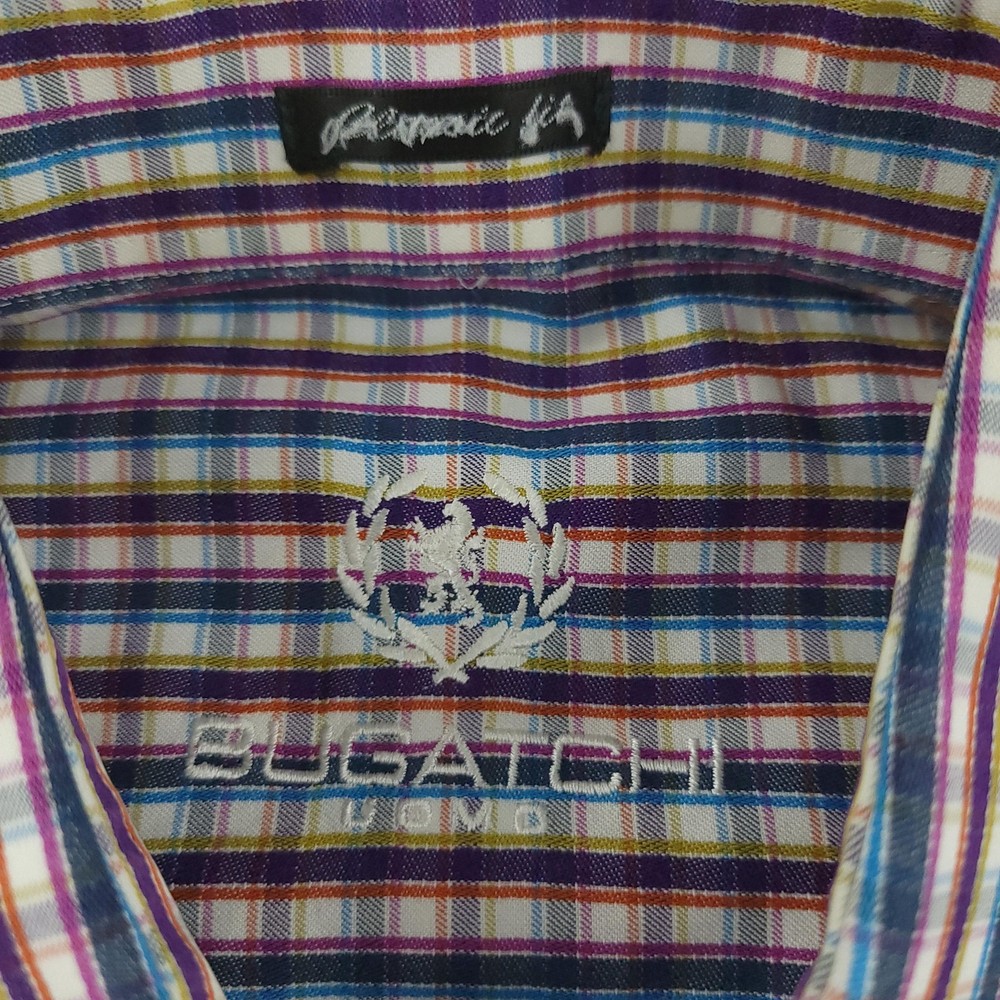 Bugatchi Uomo Dress Shirt Mens 16.5 Multicolor Check Cotton Slim Long Sleeve Brand: Bugatchi Uomo. Style: Mens long sleeve button front dress shirt with a spread collar, single chest pocket, and barrel cuffs. Color: White base with multicolor mini check pattern in blue, red, yellow, and purple. Size on tag: Mens 16.5 neck Material: 100% cotton woven fabric. Features: Slim tailored silhouette suitable for business or office wear, structured spread collar, full button front with contrast-stitched buttons, left chest pocket with pattern-matched construction, long sleeves with two-button adjustable barrel cuffs and sleeve plackets, curved shirttail hem designed to be worn tucked, interior Bugatchi crest and logo embroidery at back neck, interior care label indicating 100% cotton fabric with RN 99428 and CA 00604. Measurements are included in the photos, compare measurements with your item to ensure proper fit. Items are added daily click here to Visit My Store Combined shipping for US customers is 1.99 for each additional item Items are cleaned per eBay standards & policies