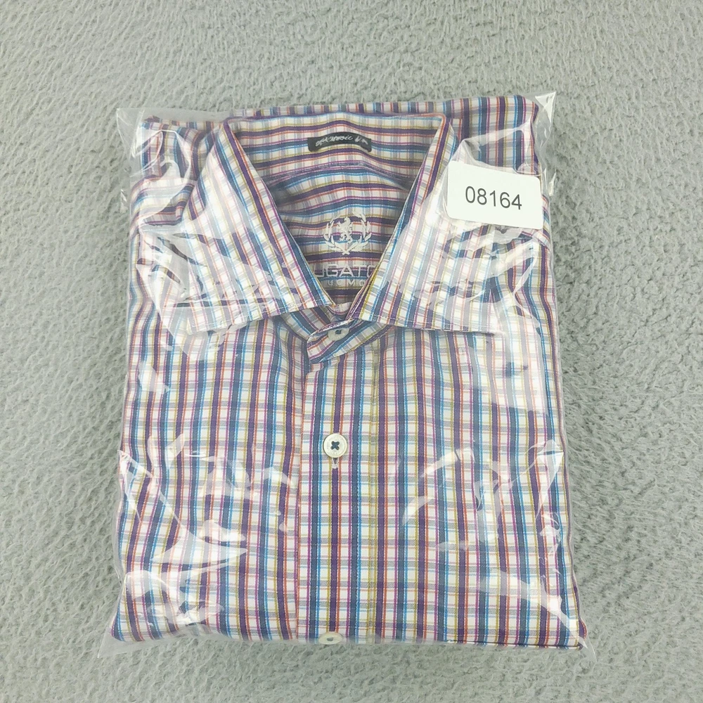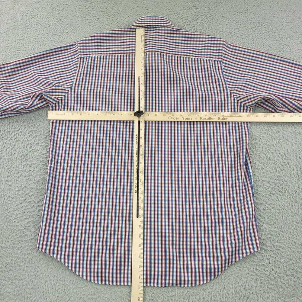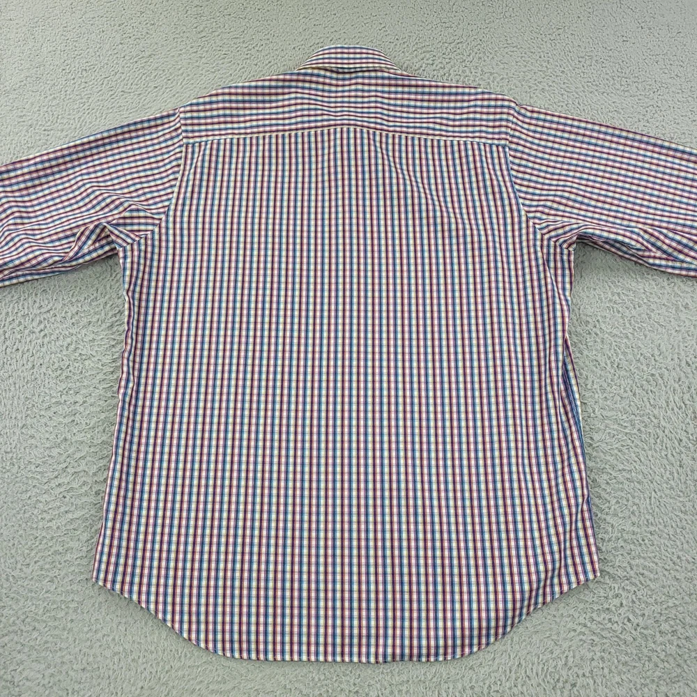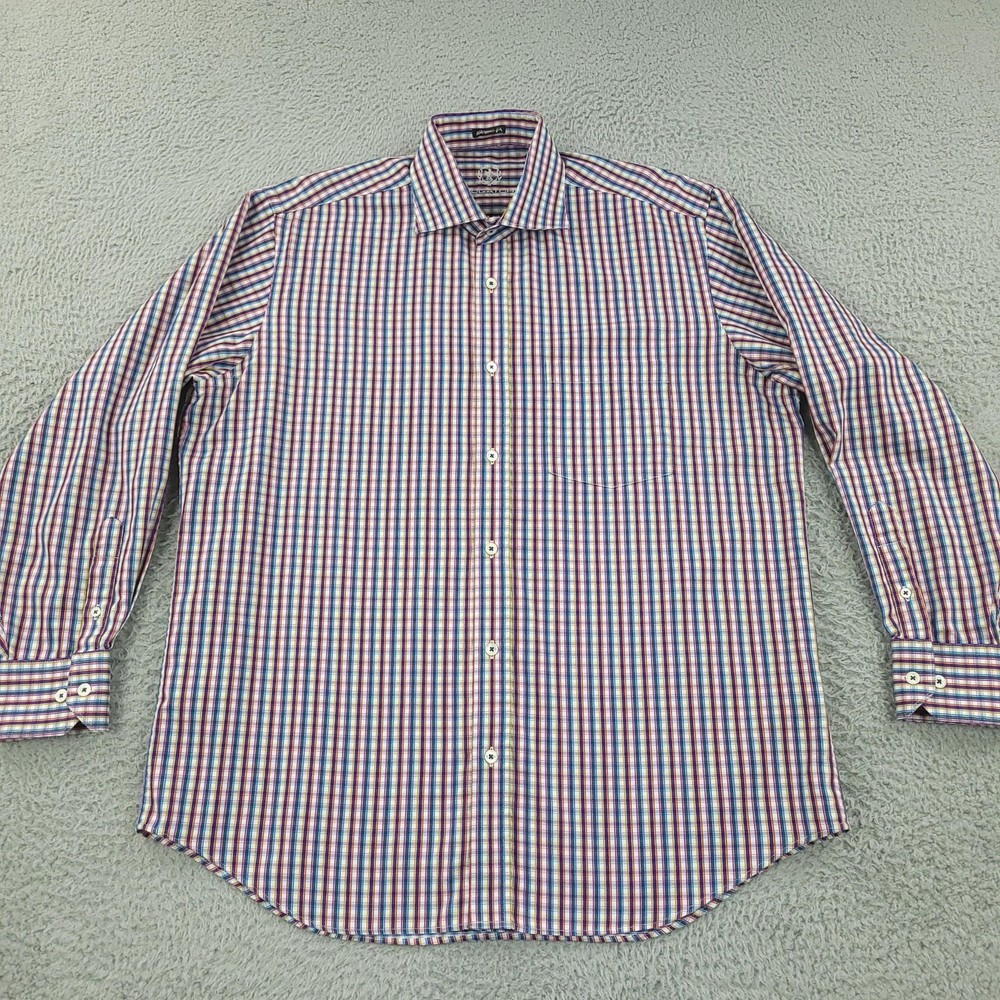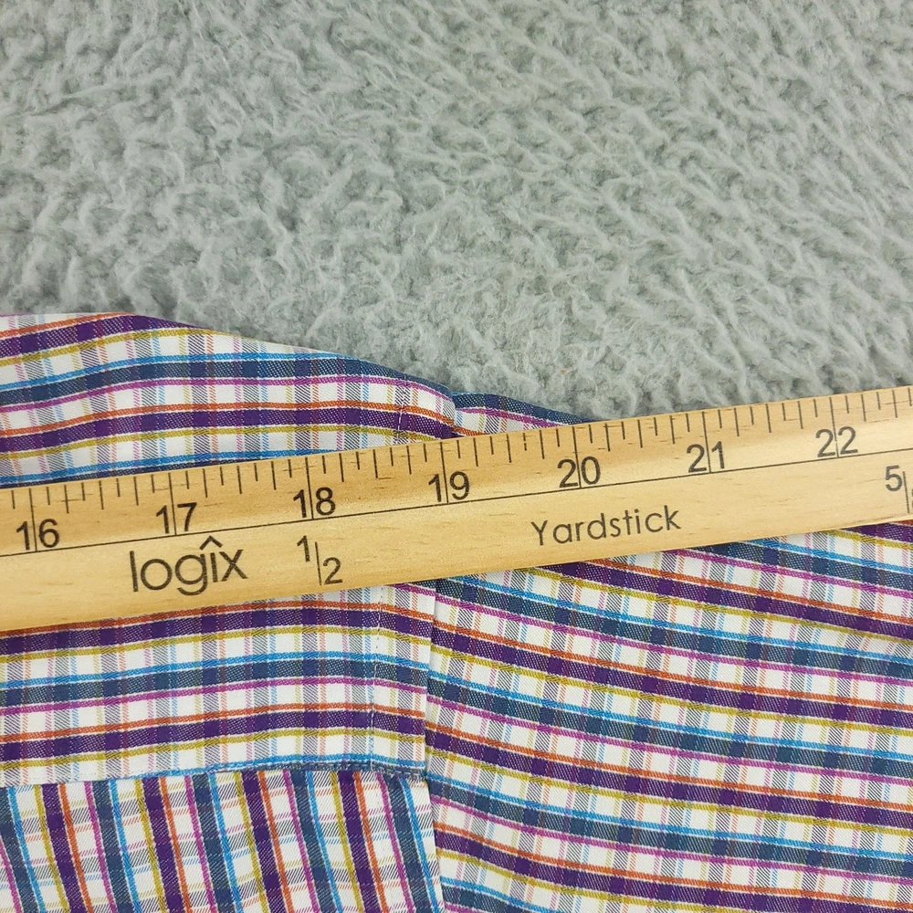 Bugatchi Uomo Dress Shirt Mens 16.5 Multicolor Check Cotton Slim Long Sleeve Brand: Bugatchi Uomo. Style: Mens long sleeve button front dress shirt with a spread collar, single chest pocket, and barrel cuffs. Color: White base with multicolor mini check pattern in blue, red, yellow, and purple. Size on tag: Mens 16.5 neck Material: 100% cotton woven fabric. Features: Slim tailored silhouette suitable for business or office wear, structured spread collar, full button front with contrast-stitched buttons, left chest pocket with pattern-matched construction, long sleeves with two-button adjustable barrel cuffs and sleeve plackets, curved shirttail hem designed to be worn tucked, interior Bugatchi crest and logo embroidery at back neck, interior care label indicating 100% cotton fabric with RN 99428 and CA 00604. Measurements are included in the photos, compare measurements with your item to ensure proper fit. Items are added daily click here to Visit My Store Combined shipping for US customers is 1.99 for each additional item Items are cleaned per eBay standards & policies
