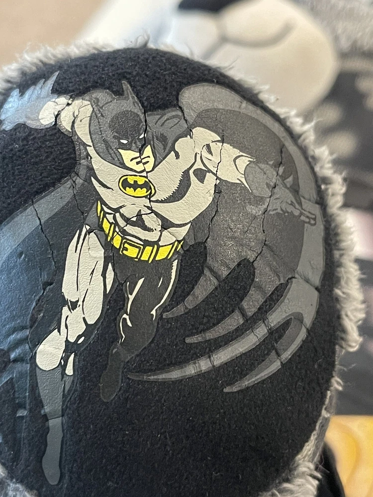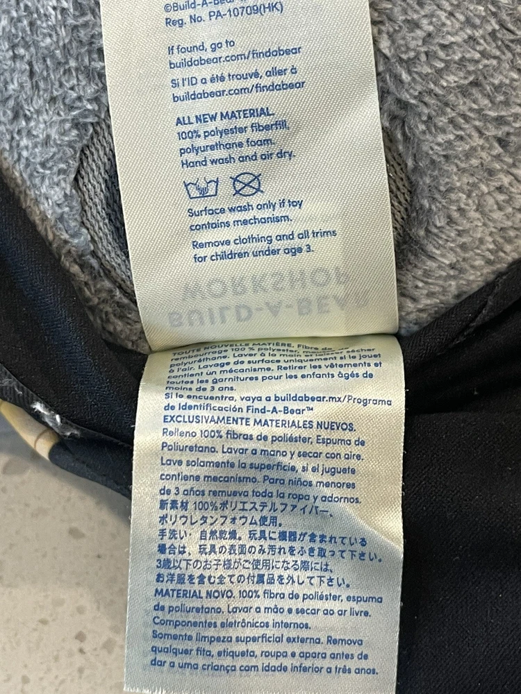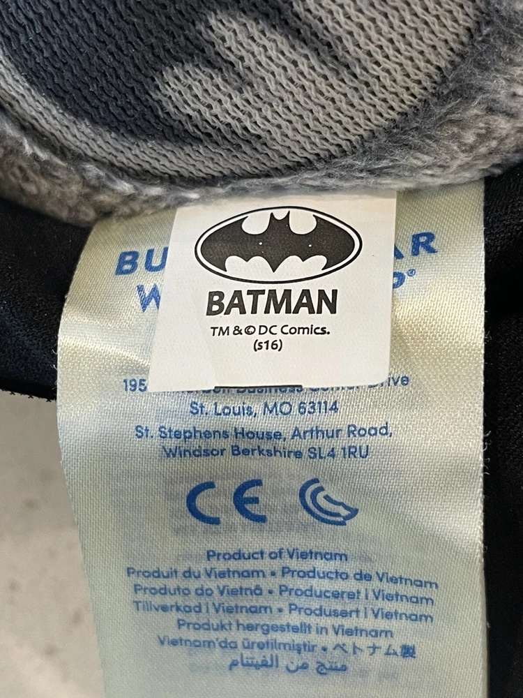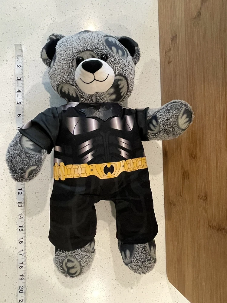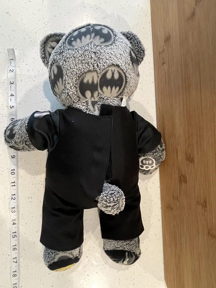 This Build-A-Bear Workshop plush bear is the perfect addition to any superhero fan's collection. With a gray color and 17" size, this retired 2016 Batman Teddy Bear Stuffed Plush is a must-have for any occasion. The bear comes without packaging and is sold as a single unit. Featuring black eyes and a DC Comics collection, this plush bear is made of high-quality materials and weighs 13 oz. It is suitable for ages 3+ and is perfect for any antique or vintage collector. This bear is not personalized and is not signed, but it is still a great addition to any collection. This comes with the bear and the Batman suit. From a smoke-free home.