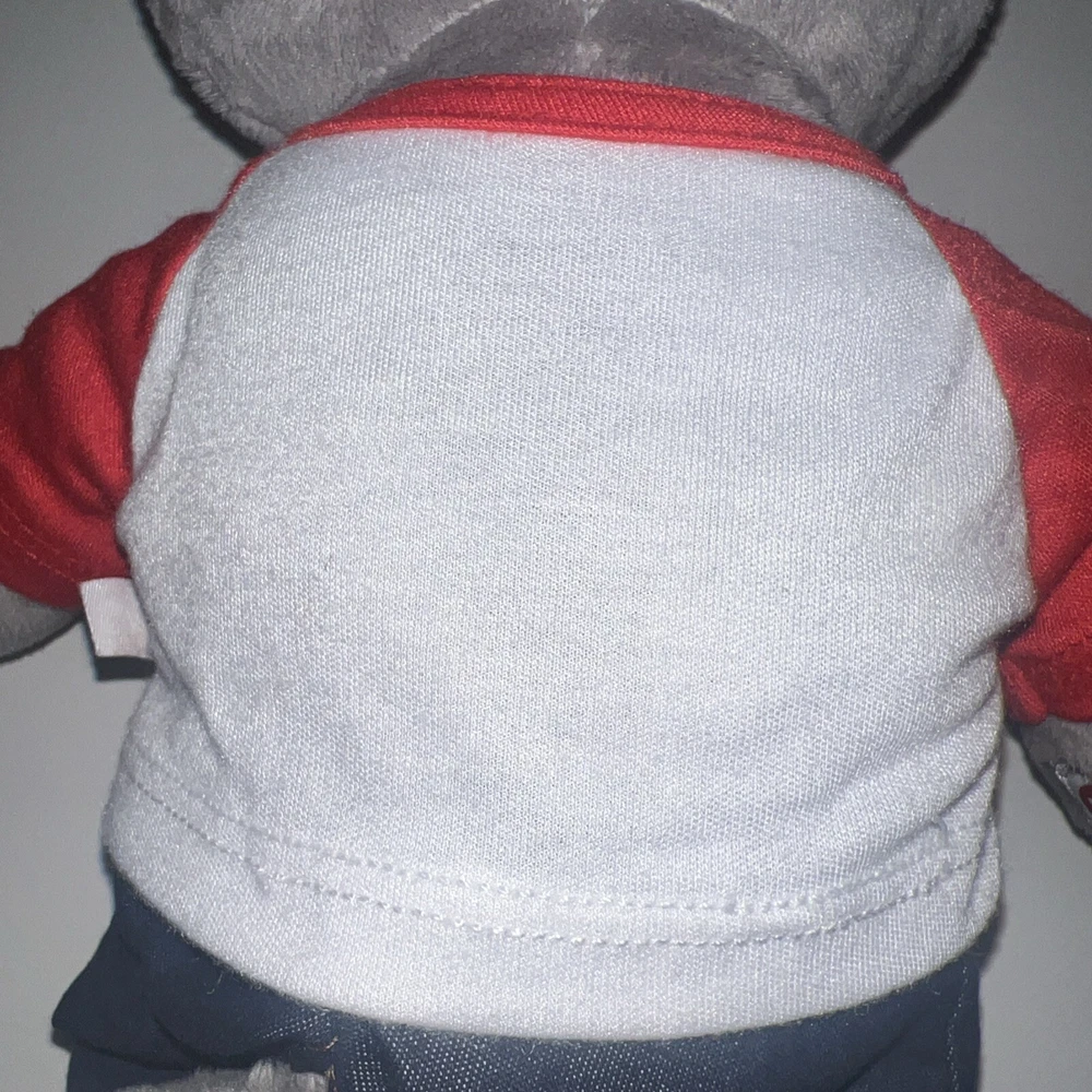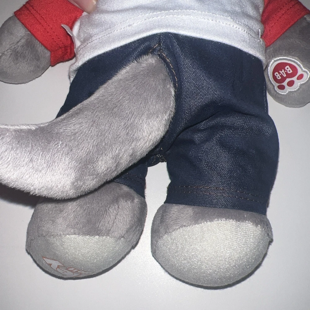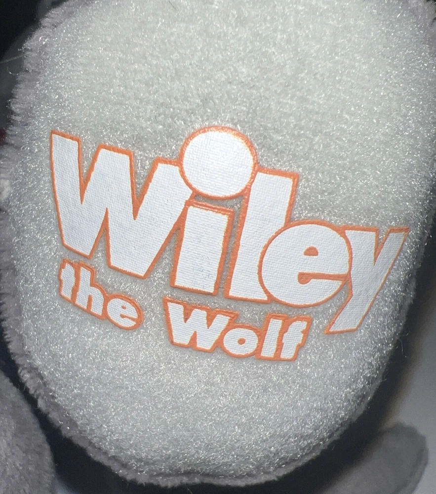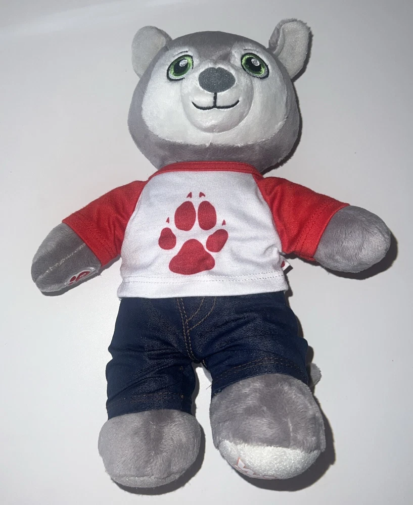 This is a 12" Build-A-Bear Workshop plush bear named Wiley the Wolf from the Great Wolf Lodge franchise. The bear has green eyes and comes with a shirt and pants. It is not antique or vintage, and is suitable for children aged 3-4 years. This non-signed bear is gray in color and is not personalized. It is an original creation, not a licensed reproduction, and is made of plush material. The bear is from China and does not come with packaging.