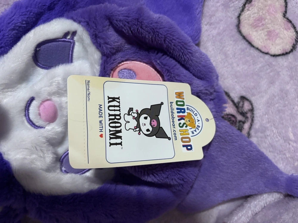 The product is a Build-A-Bear Workshop plush stuffed animal of Kuromi, a character from the Hello Kitty franchise by Sanrio. It is purple in color and made of plush material. The stuffed animal represents a rabbit and was manufactured in 2023. It is an exclusive plush item featuring the popular Kuromi character.