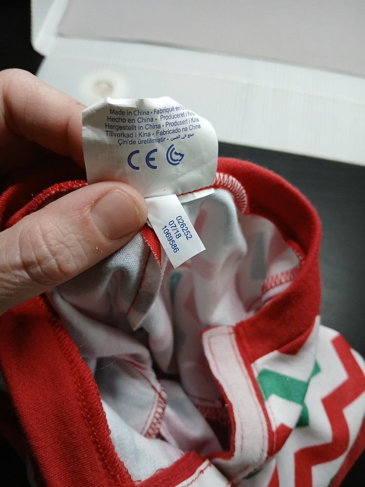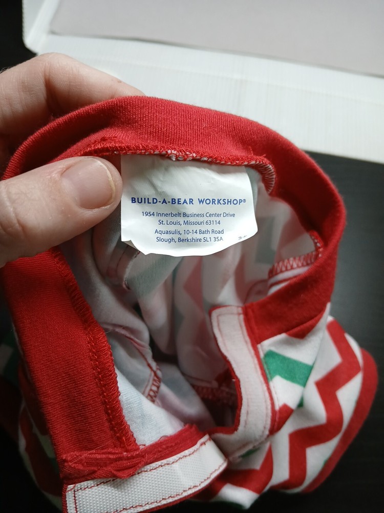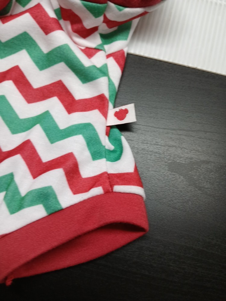 This product is a used Build-A-Bear Workshop clothing item designed as a red and green chevron sleeper for a reindeer stuffed animal. The product is titled "Build A Bear Merry Mission Red/Green Chevron Reindeer Sleeper".