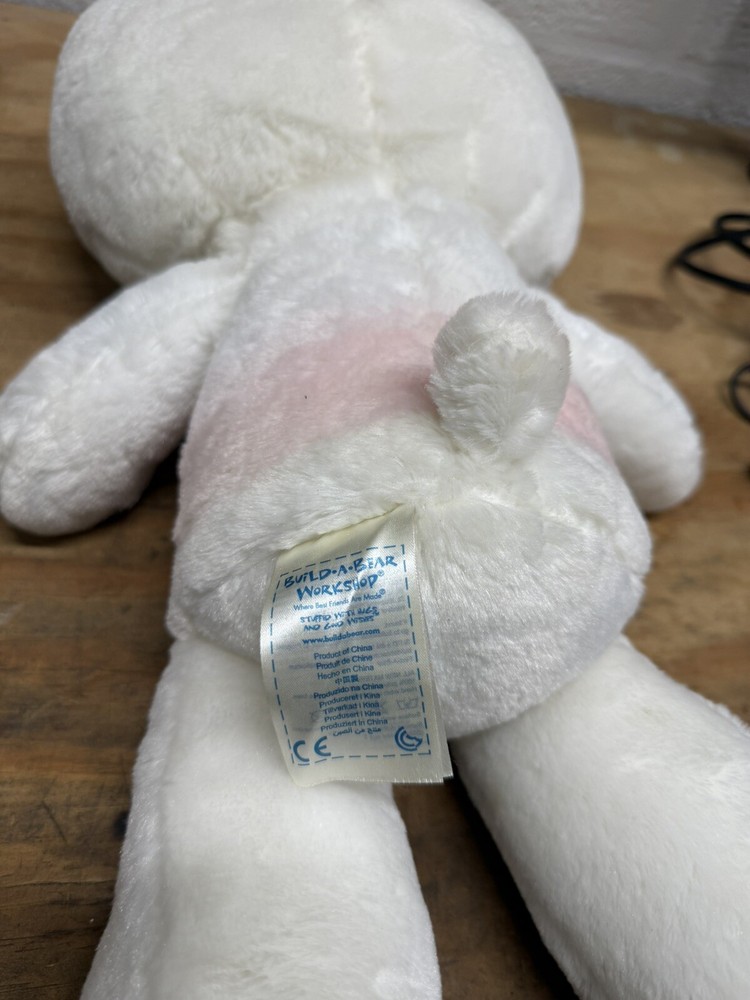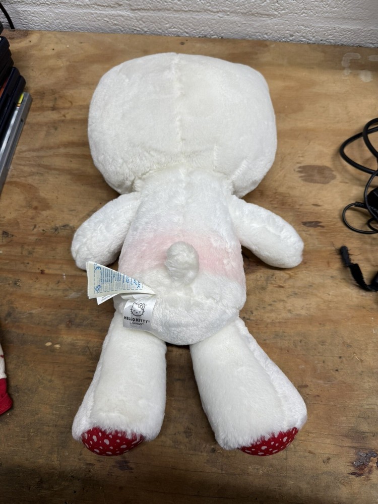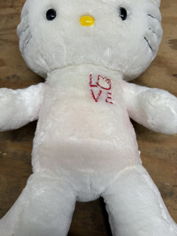 This Build-A-Bear Workshop creation features a 20-inch white Hello Kitty stuffed animal from the Sanrio collection, designed for Valentine's Day in 2012. The plush bear is adorned with cute heart patterns and is a limited edition, retired item. It comes without packaging and does not include the bow accessory. Perfect for fans of Hello Kitty, this original, licensed stuffed animal is a charming addition to any collection. PINK ON BEAR WHERE OUTFIT WOULD BE, SEE PHOTOS. NO OUTFIT OR BOW INCLUDED. FAST SHIPPING.