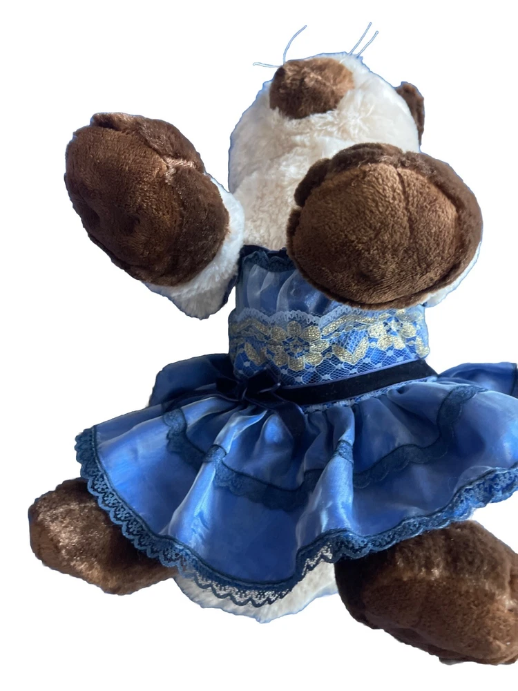 The "Build A Bear Siamese Cat Plush Promise Pet" is a 12-inch plush toy from the Build-A-Bear Workshop collection. It features brown and cream colors with blue eyes, resembling a Siamese cat. The toy comes with a dress included and is part of the Promise Pets collection, designed for animal lovers. This original plush bear represents a cat and bear hybrid, making it a unique addition to any stuffed animal collection, especially for those who appreciate the charm of Siamese cats.