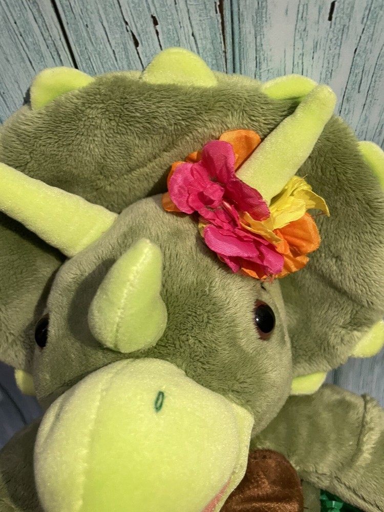 This Build A Bear Triceratops Dinosaur plush is a must-have for any dinosaur lover! The 18 inch green dino is made of soft plush material and comes with clothing. It's perfect for adding to a collection of animal-themed toys and would make a great addition to any child's room. The triceratops is an original, licensed reproduction from the Build-A-Bear Workshop franchise and is not vintage or antique. P1