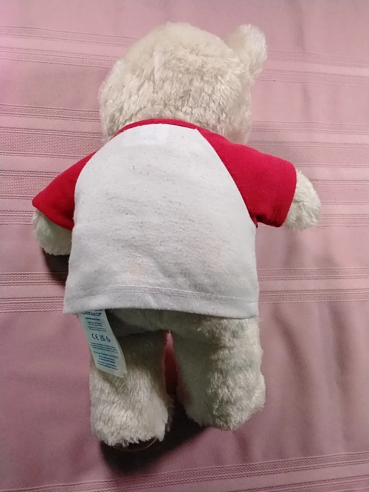 There is some pilling on the shirt. This adorable white plush bear from Build-A-Bear Workshop comes with a cozy Hugs T-Shirt, perfect for snuggling up with. The bear stands at 15 inches tall and has beautiful brown eyes. Made from soft polyester material, this original Build-A-Bear is perfect for any bear lover. As part of the Build-a-Bear franchise, this plush bear is a must-have for any collector or fan. It was manufactured in 2021 and is an original piece. The bear is in excellent condition and ready for a new home. Don't miss your chance to add this cute and cuddly bear to your collection!