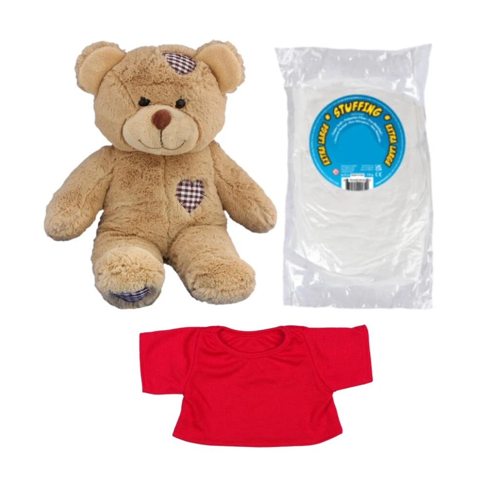 Build Bear Workshop 16" Patch Bear Plush Set - Build Your Own Friend Kit Create your own cuddly companion with the Build Bear Workshop 16" Patch Bear Plush Set! This DIY kit is perfect for kids, collectors, or anyone who loves bringing their own plush creations to life. Easy to assemble, this set includes everything you need to make your unique bear plush toy. Kit Includes: 1 Brown Patch Bear Skin (16") – Soft and cuddly, ready for you to fill and customize. 1 Fiber Filling – Enough to stuff your bear to the perfect level of fluffiness. 1 Red T-shirt – Dress your bear in this stylish shirt, giving it a fun and playful look! Whether you're making it for yourself or as a special gift, this DIY plush kit is a fun and creative way to build your own friend. Ideal for crafting, playtime, or display, your custom-built Patch Bear will be ready for cuddles in no time