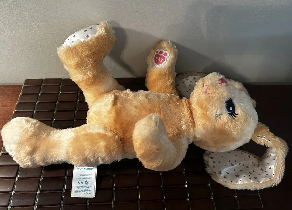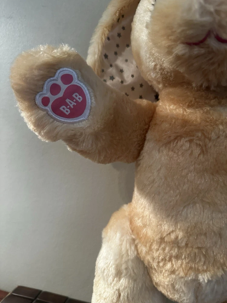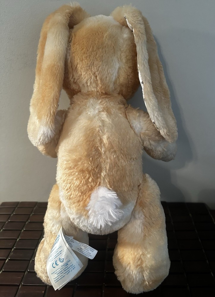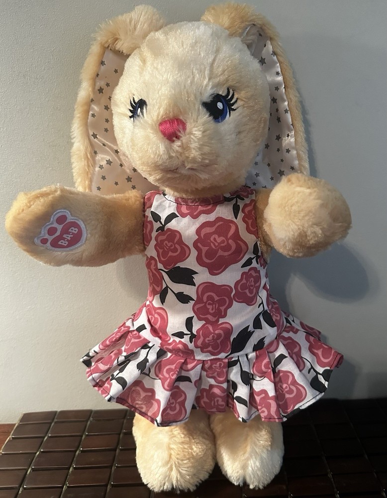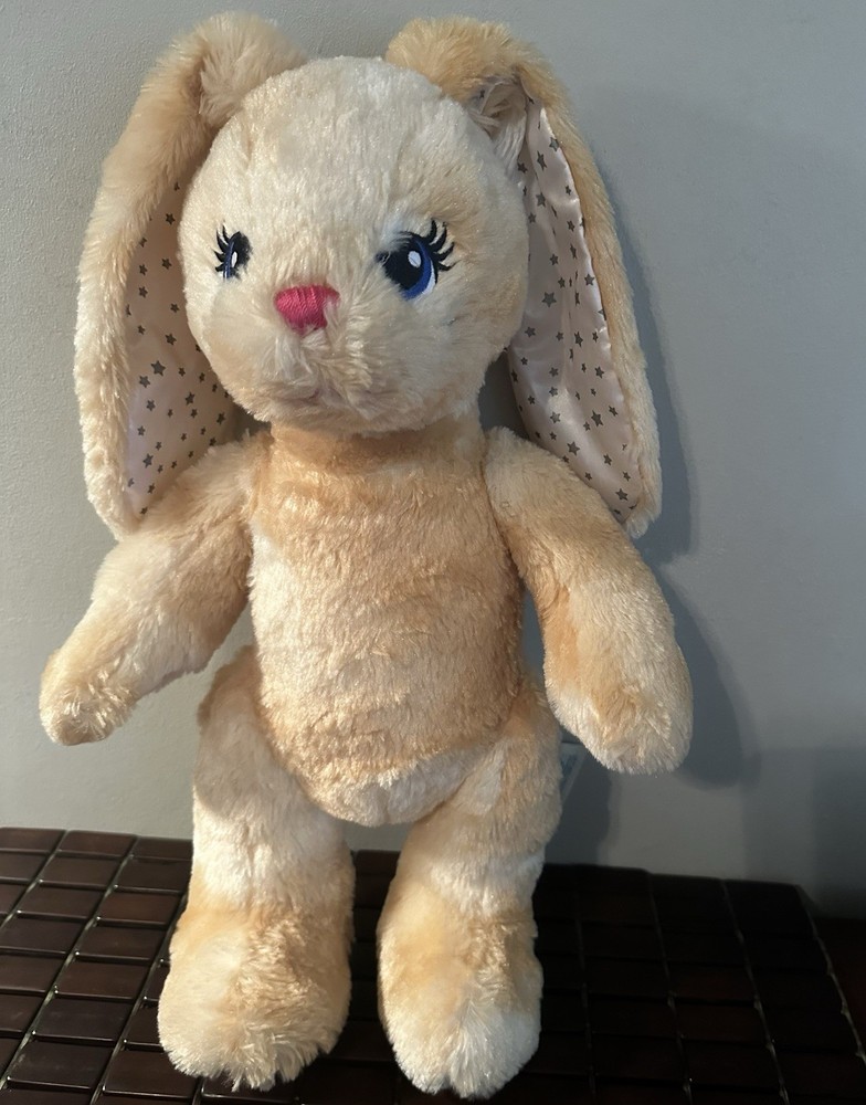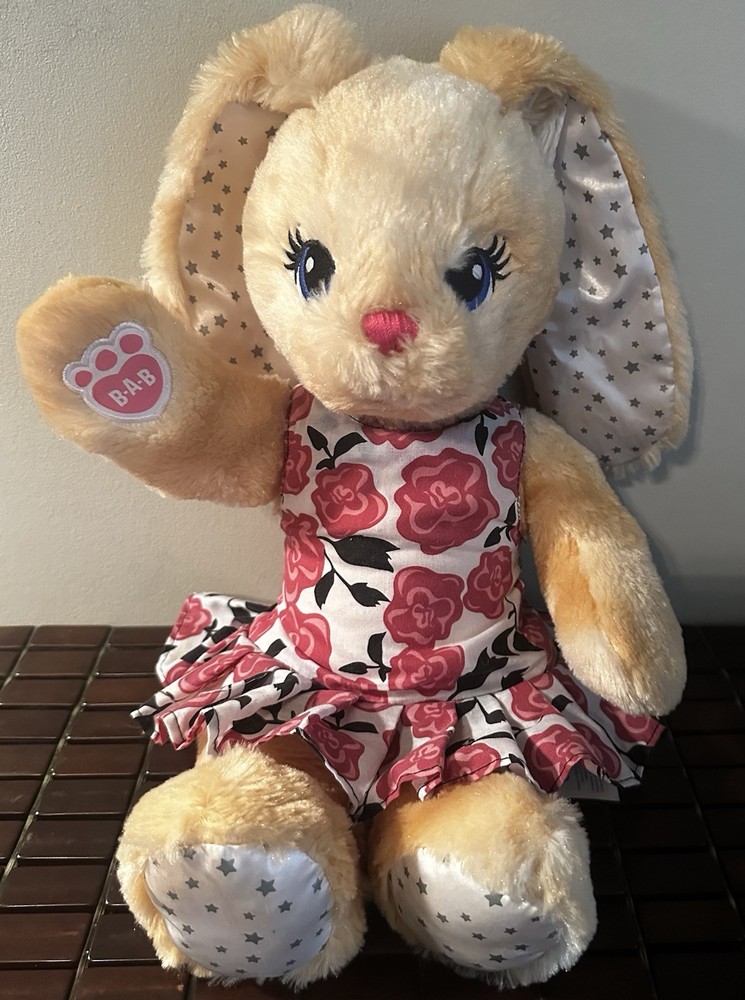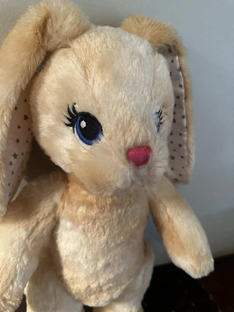 This 16" tall Build-A-Bear plush bunny features a beige and cream-colored rabbit with blue eyes. It was manufactured in 2016 and includes a dress as an additional item. The arms and legs are posable. Miss BAB’s is perfect for playtime or display. It weighs 14 oz and has a width of 5 inches. Whether you're a collector or just looking for a cute and cuddly stuffed animal, this Build-A-Bear Workshop toy is a must-have. In excellent pre owned condition, coming from a smoke free home.