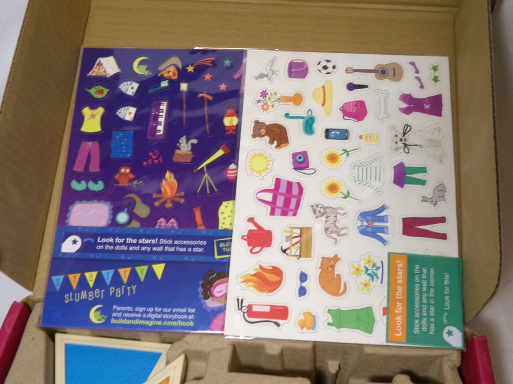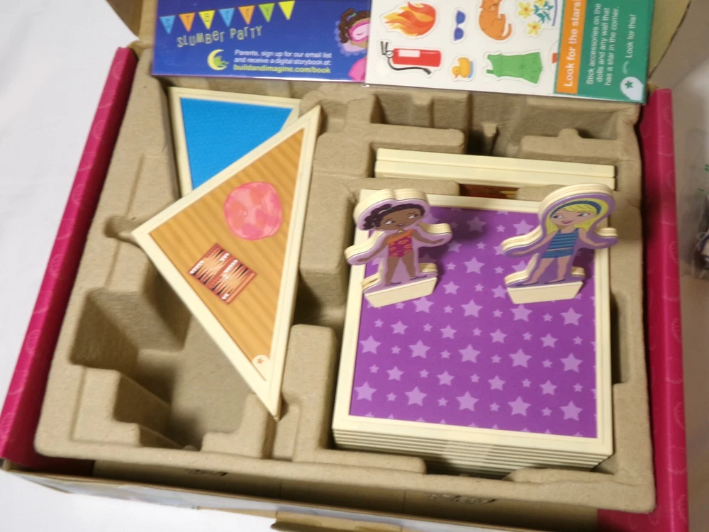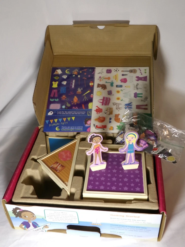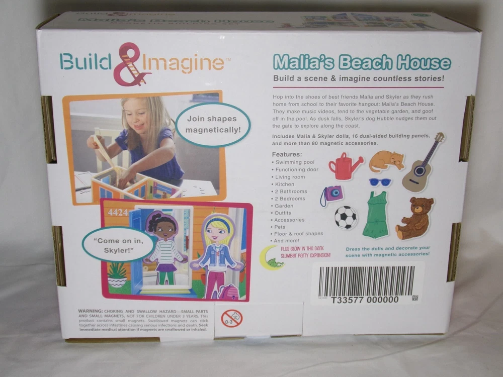 Build and Imagine Malia's Beach House w/ Slumber Party Expansion. Ages 4-8 Magnetic Building Set. 2015 Excellent Condition. Complete. Two magnets packs unopened. With a bag of magnets that were opened. One extra wall piece.