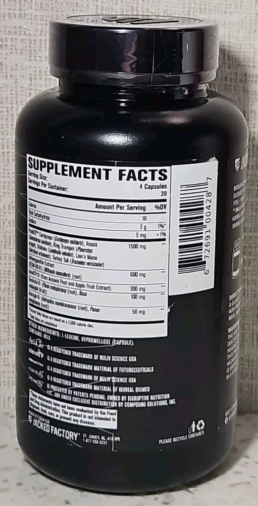 gtin13: 672691004287 MPN: NA UPC: 672691004287 Active Ingredients: ElevATP, Astragin, Peak02, SenActiv, Ashwagandha, KSM-66 Type: Sports and Fitness Performance Country/Region of Manufacture: United States Main Purpose: Bodybuilding, Endurance/Energy, Fitness, Muscle Gain, Sports and Fitness Performance, Weightlifting Supply: Up to 1 Month Ingredients: See Label Brand: Jacked Factory Expiration Date: 04/2026 Formulation: Capsule Flavor: Unflavored Type of Diet: Bodybuilding, Fitness, Gym & Training Number of Pills: 120