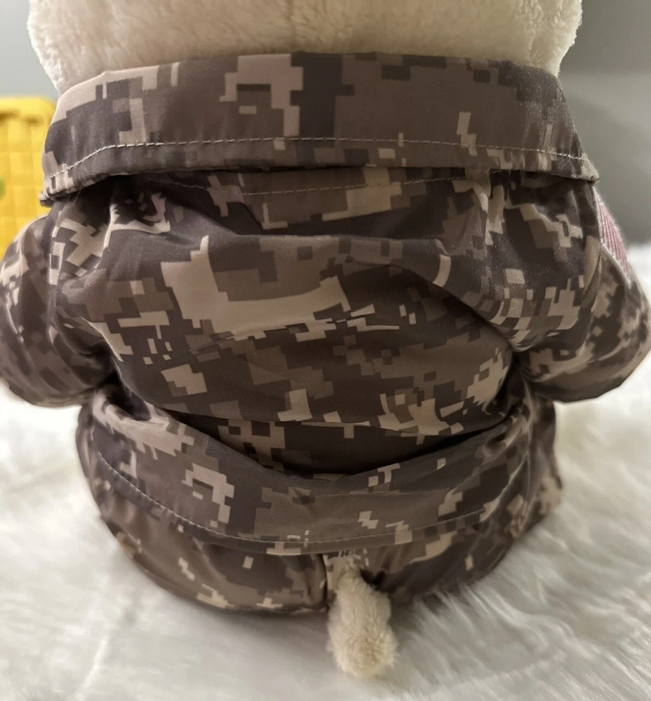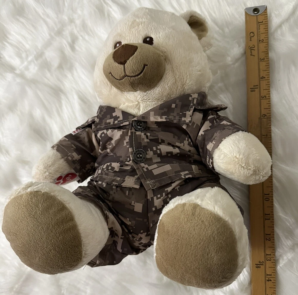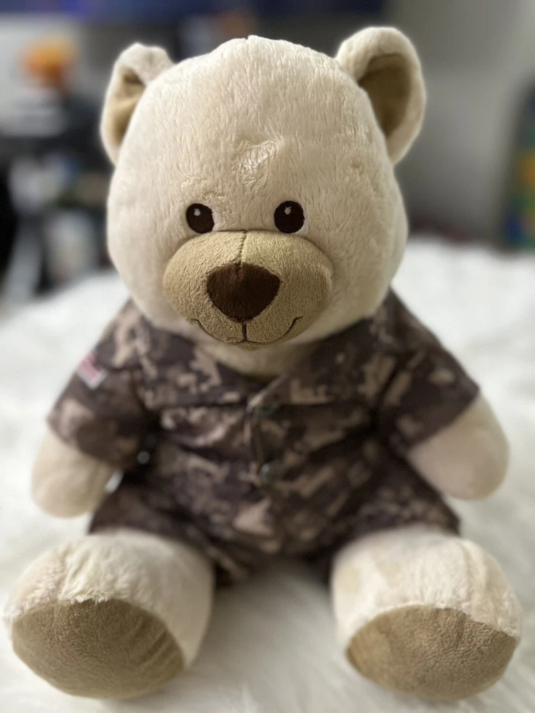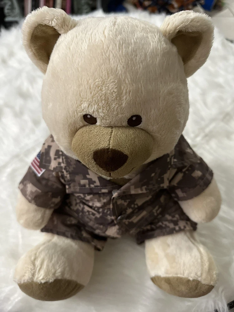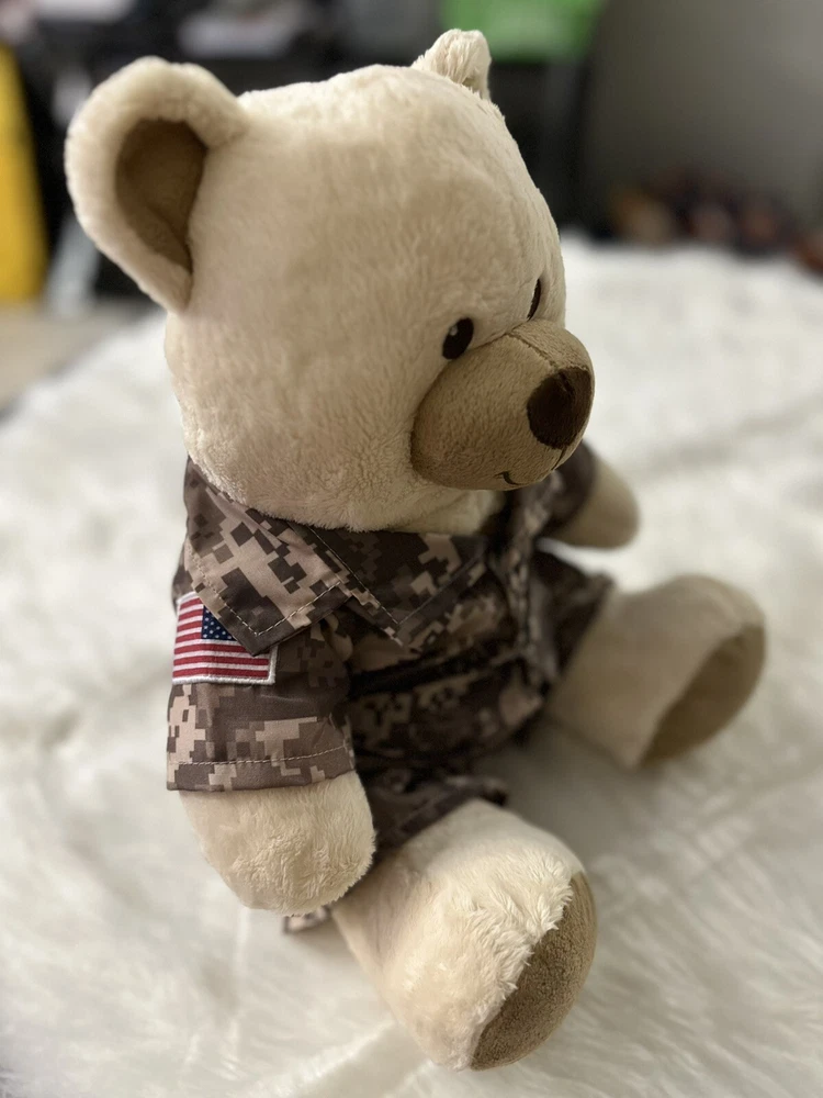 The product is a Build-A-Bear Workshop plush bear designed in honor of the U.S. military. The bear is medium-sized, tan and brown in color, and features a retired design. It is a part of the Build-a-Bear character family and is both washable and asthma and allergy-friendly. This special bear is a thoughtful gift for military members or supporters, offering a cuddly companion that also carries a patriotic sentiment.