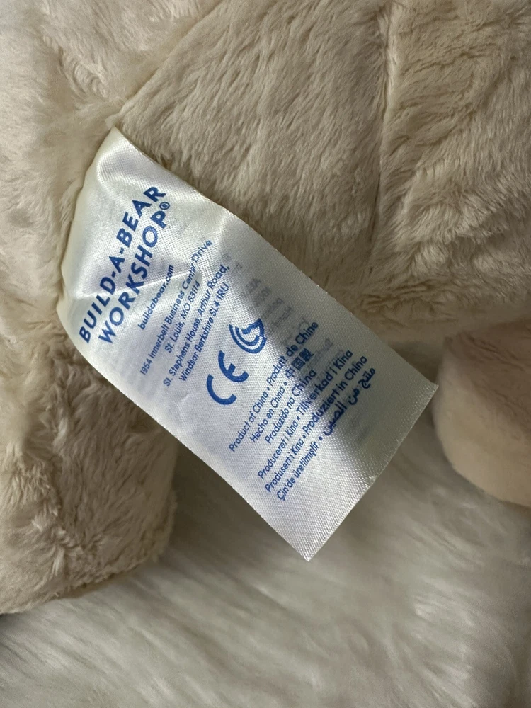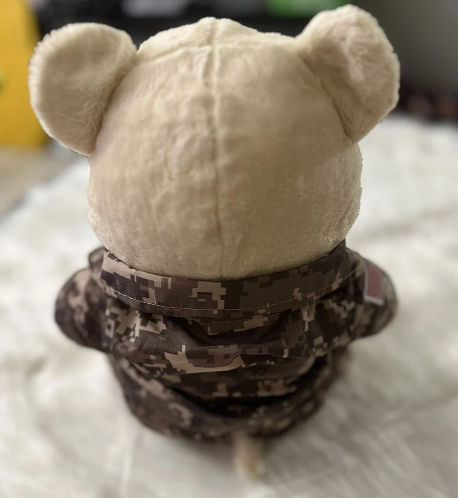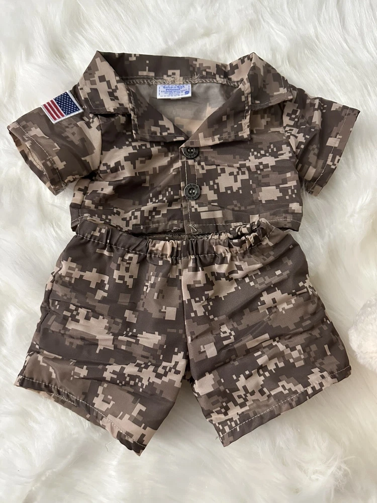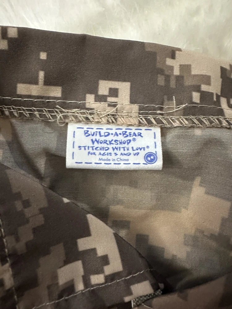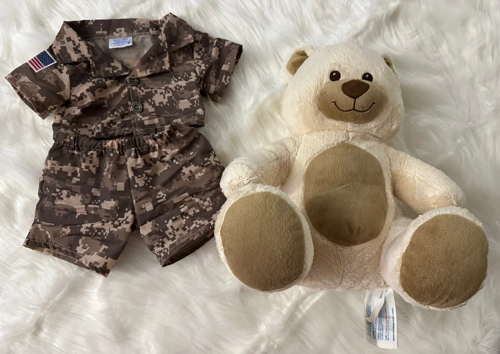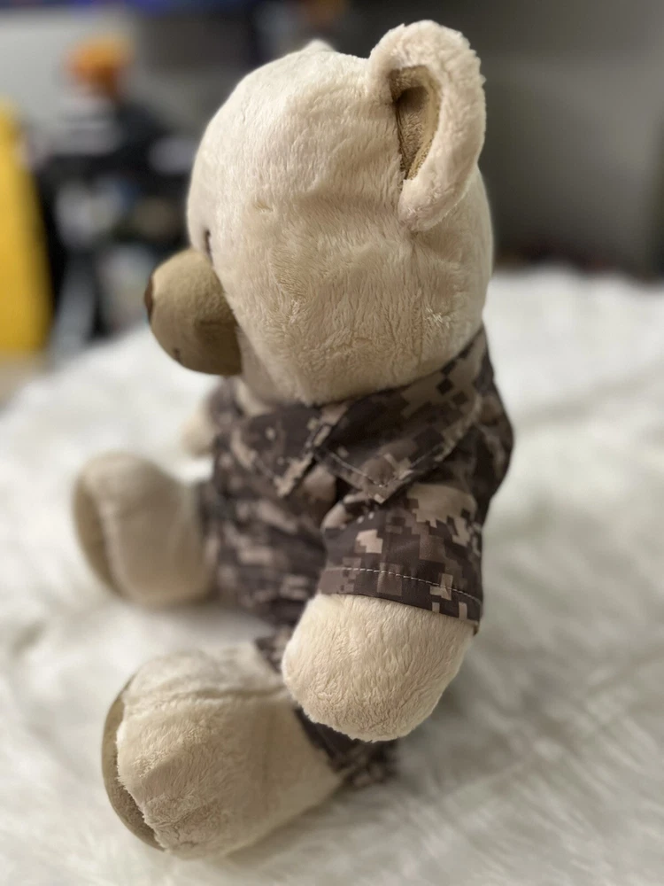 The product is a Build-A-Bear Workshop plush bear designed in honor of the U.S. military. The bear is medium-sized, tan and brown in color, and features a retired design. It is a part of the Build-a-Bear character family and is both washable and asthma and allergy-friendly. This special bear is a thoughtful gift for military members or supporters, offering a cuddly companion that also carries a patriotic sentiment.