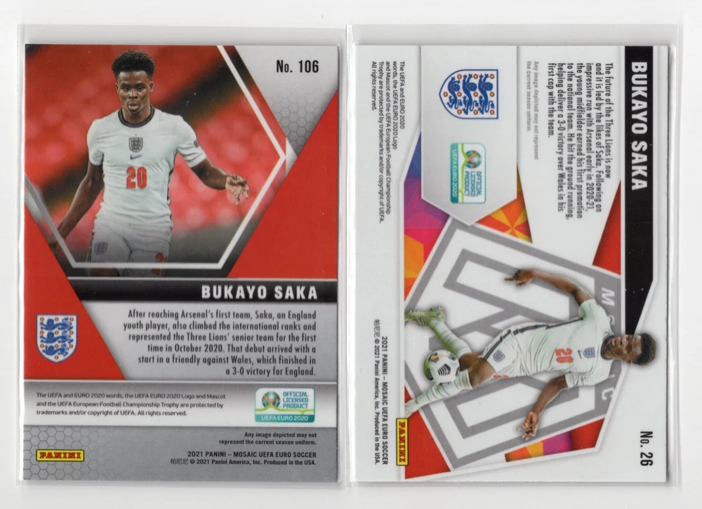 Year Manufactured:2021Sport:SoccerSeason:2020-21Manufacturer:PaniniSet:2021 Panini Mosaic EurosType:Sports Trading CardPlayer/Athlete:Bukayo SakaNumber of Cards:2League:UEFA European Championships