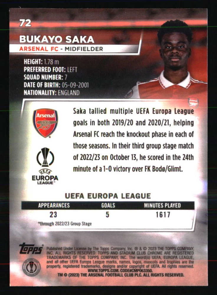 Team: Arsenal FC Season: 2022 Graded: No Set: 2022-23 Stadium Club Chrome UEFA Club Competitions Card Number: 72 Player|Athlete: Bukayo Saka Autographed: No Sport: SOCCER Year Manufactured: 2022 Type: Sports Trading Card