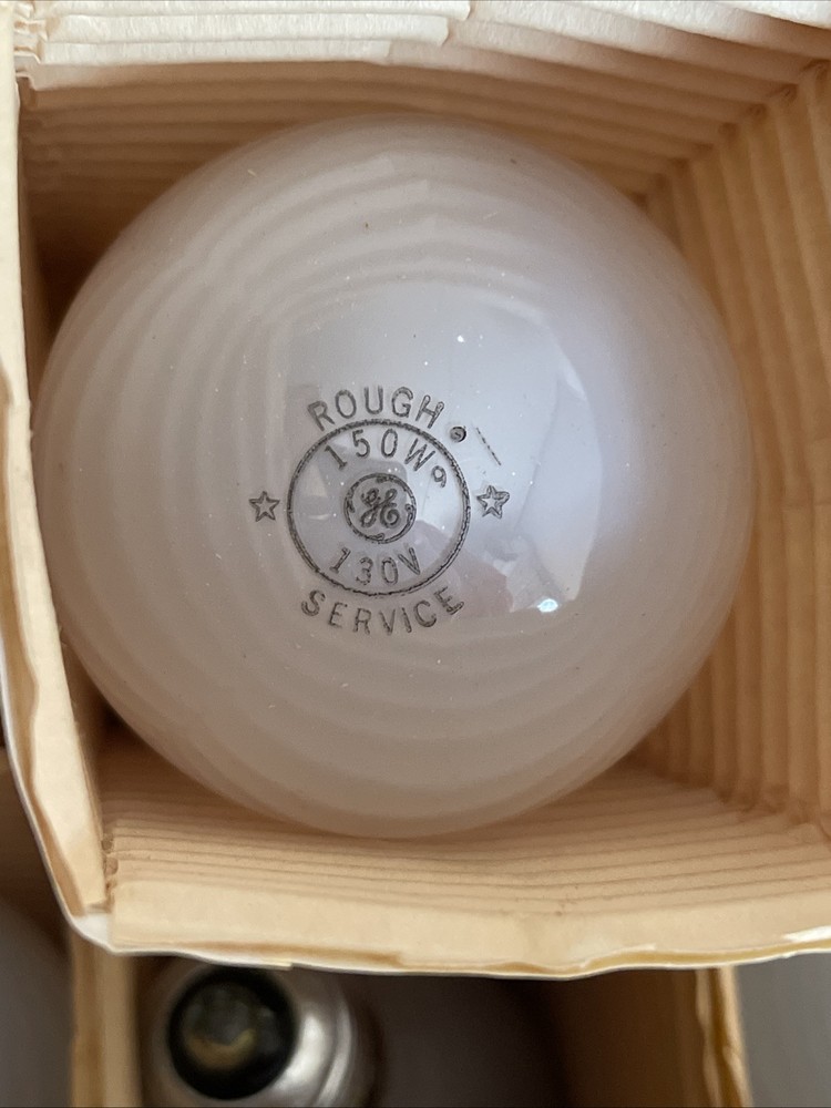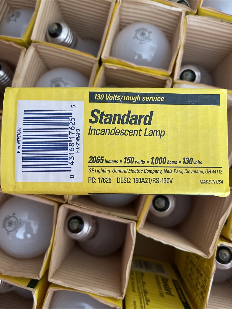 The product is a pack of 50 new vintage GE 150W rough service light bulbs, model A19, with a brightness of 2065 lumens each. The bulbs are intended for industrial or commercial use and are made in the United States. The title indicates that the price is for a pack of 50 bulbs. I’m selling these packages of 50, giving you an extra 10. This will be 60 total in the case. The reason for that is shippers are pretty tough on the filament and I’m hoping that you’ll get the 50 that you bought with no damage. If you do have damage, there’s 10 extras in there to compensate.