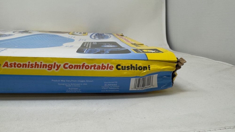 BulbHead Egg Sitter Seat Cushion with Non-Slip Cover, Breathable Honeycomb brand new never been used damaged box bent from the top Most chair cushions do a mediocre job at supporting your backside. But they usually are bulky, get too hot, and have a hole cut out in the cushion to accommodate your tail bone. The Egg Sitter® support cushion supports your backside so well that you can sit on an egg without breaking it! Sit on the hardest surface and still feel comfortable. Egg Sitter® has a honeycomb design made of ultra-flex polymer that stays cool to the touch, allowing air to circulate. It collapses in on itself to absorb pressure points. Use on your chair in the dining room, in the car, and at the office. It’s time to say goodbye to sore muscles from sitting all day at your computer or lower back pain from driving long trips. Egg Sitter® includes a non-slip, washable cover. For optimal support, start sitting on an Egg Sitter® support cushion. highlights Absorbs pressure points Allows proper air circulation Retains shape Strong & durable design Made of ultra-flex polymer Unique honeycomb construction Fits most chairs Measures 15.5-inches X 14-inches X 1.5-inches