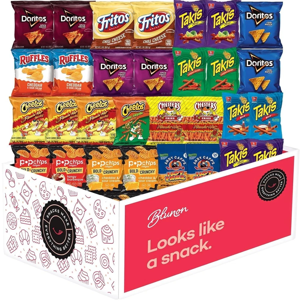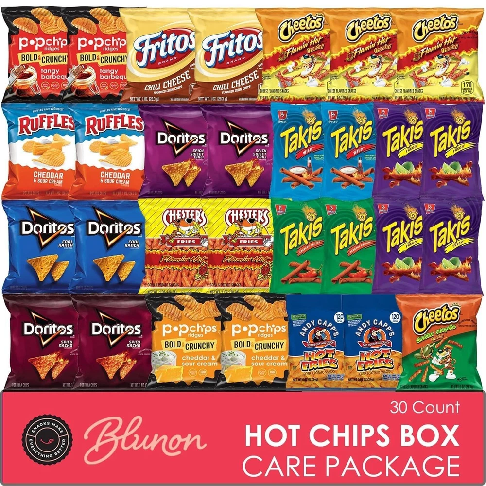Flavor Cheddar,Jalapeno,Buffalo,Spicy Unit Count 30.0 Ounce Number of Items 30 Type Potato Chip Get an extra zing in each mouthful with Blunon's snack bag variety pack. A convenient and economical way to buy all your favorite hot and spicy snacks. With 30 packs, this purchase gives you plenty of treats to last awhile. Stock up your pantry, slip in your bag, or fill up your office desk to share with coworkers and friends. Also a great gift for kids in college or anyone who loves sweet treats. Pack the heat! Assortment includes: Takis, Doritos Cool Ranch, Sweet Chili and Spicy Nacho, Cheetos Cheddar Jalapeno and Flamin Hot, Popchips Bold & Crunchy, Fritos, Chesters Hot, and Andy. Due to supply chain issues, substitution may occur. This great package includes all of your favorites to satiate any craving, from spicy to hot, buffalo to jalapeno, and everything in between. It includes all of the tastiest brands such as Takis, Doritos, Cheetos, Popchips, Fritos, Andy, and Chester's. The variety packs, with individual serving sizes, make on-the-go snacking easy. They are a convenient and economical way to buy all of your favorite snacks. Grab one in the car, at work, packed for lunch, or enjoy it at home! Great for trips, parties, school, and holidays and make a thoughtful addition to care packages or a get-well gift for someone special. Each package contains 30 single-serve bags of your favorite snack bags individually wrapped for portion control. Perfect for kids and adults too.
