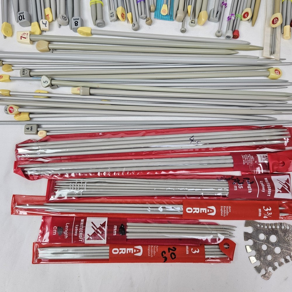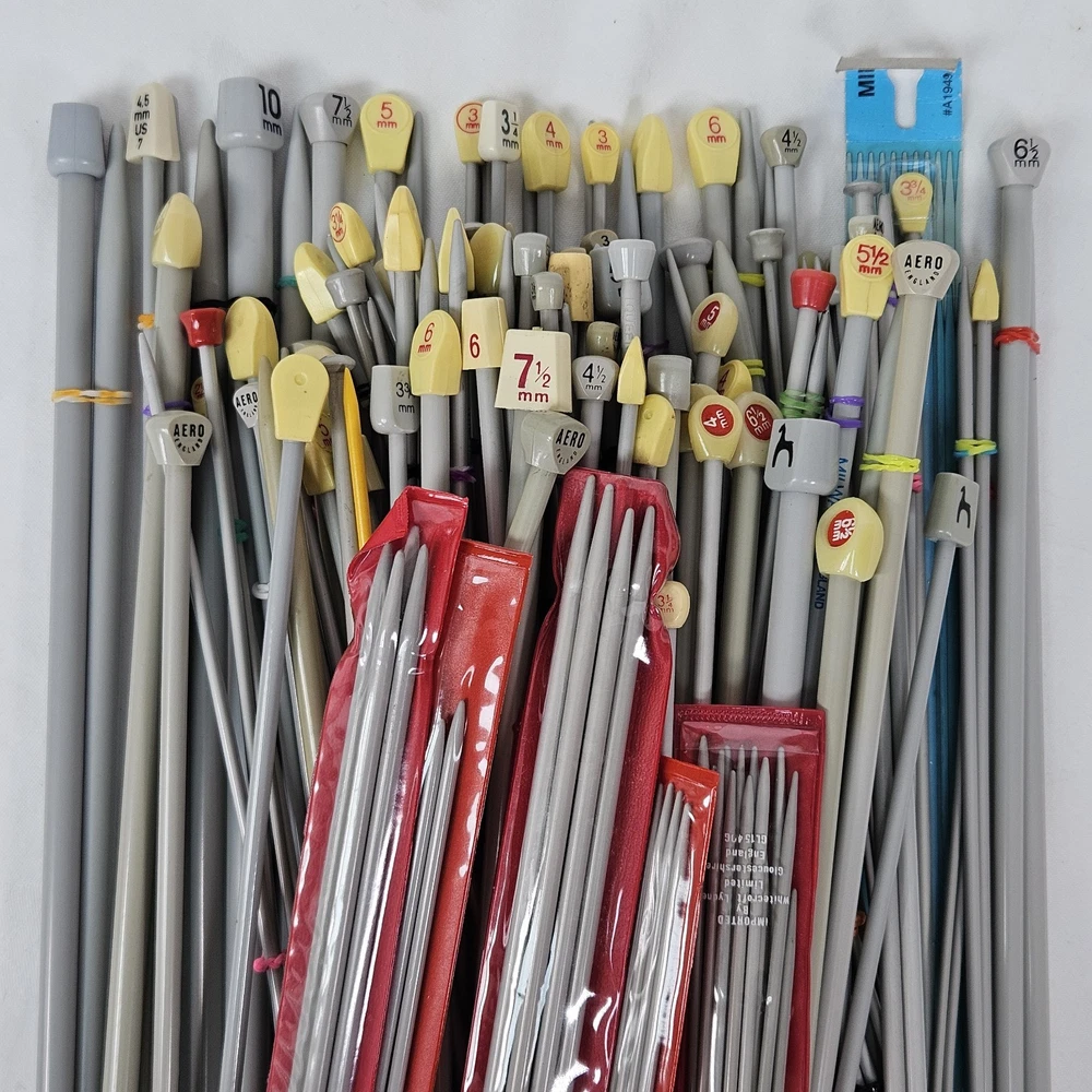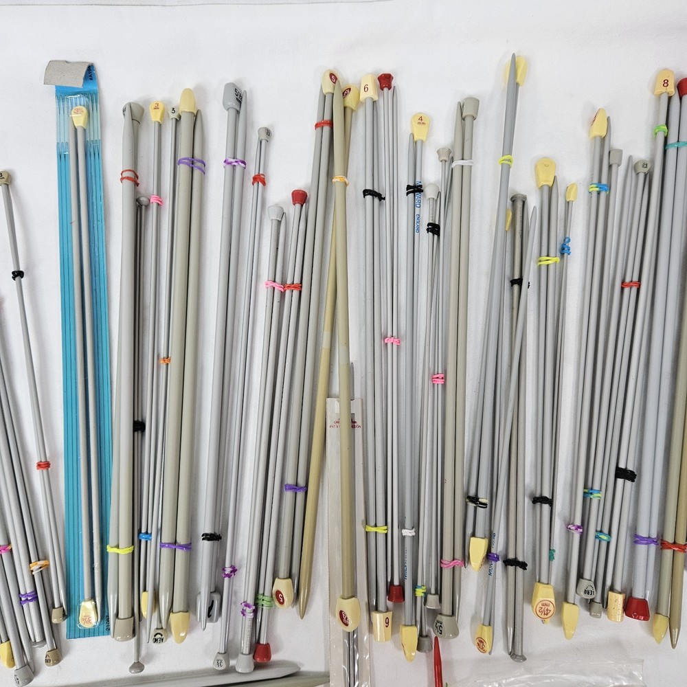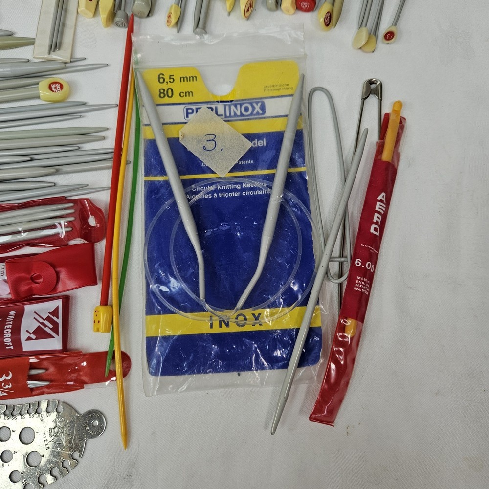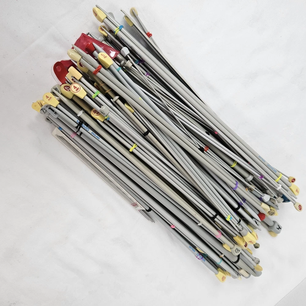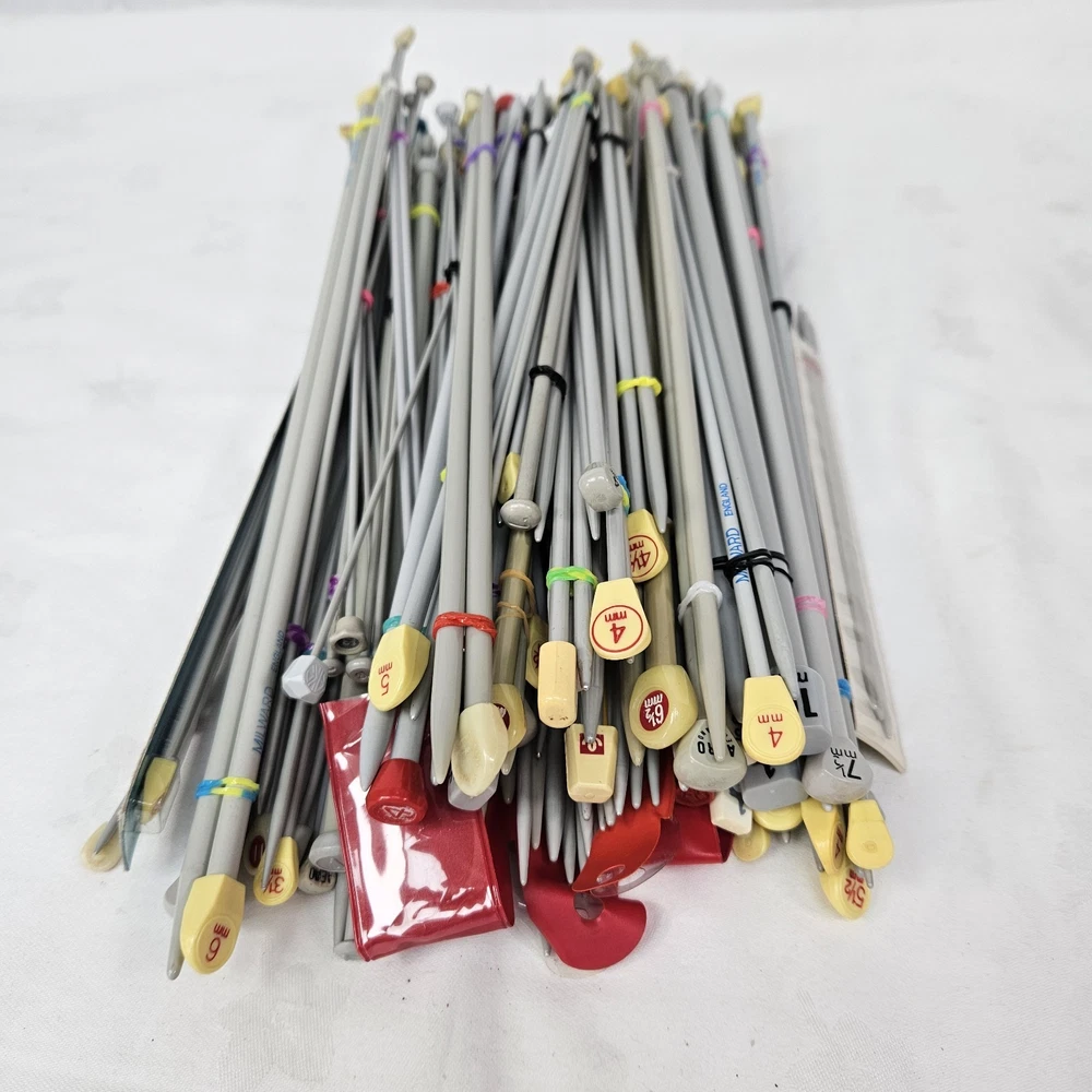 Large mixed job lot of vintage knitting needles and accessories. This bundle includes 30+ pairs of knitting needles in a wide range of sizes and lengths, along with a selection of extras such as circular needles and knitting accessories/tools . Mostly classic aluminium needles with various brands visible (see photos), plus some larger sizes and speciality pieces. A great mixed lot All items are exactly as shown in the photos – a well-balanced mix with potential. Condition Summary Used vintage condition with general signs of wear. Some items are unused/sealed. See photos for full detail.