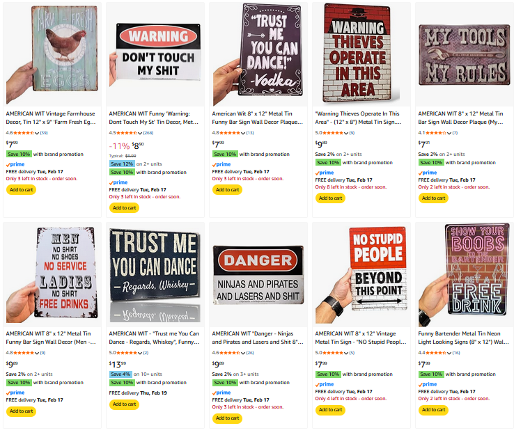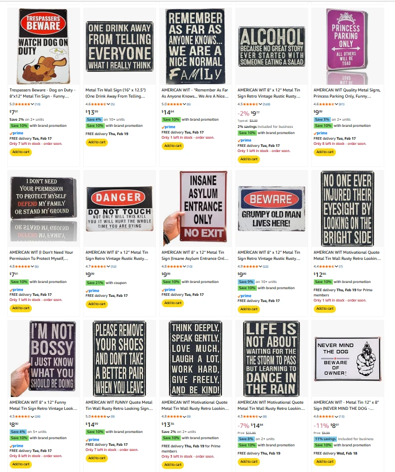 Freeboutiquetemplates.com American Wit Bulk Funny Bar Novelty Metal Tin Signs - Random Assortment (8" x 12") Garage Man Cave Restaurant Pool Hole Home Bar Vintage Wall Decor About this item 🍻 Funny Vintage Bar Wall Decor: Add humor and retro style to any space with these funny bar novelty metal tin signs. Featuring classic vintage-inspired designs and witty bar-themed sayings, these 8" x 12" signs bring personality and charm to garages, man caves, home bars, restaurants, and game rooms. 🪧 Durable Metal Construction: Made from sturdy metal tin, each sign is designed to last with a lightweight yet durable build. The printed designs offer a vintage look that complements rustic, industrial, and retro décor styles while remaining easy to hang or display. 🏠 Perfect for Multiple Spaces: Ideal for decorating garages, man caves, pool halls, restaurants, home bars, kitchens, patios, and entertainment rooms. These signs also work great as conversation starters, themed décor accents, or fun focal points for social spaces. 🎁 Great Bulk Décor & Gift Option: Random Assortment. All Different Designs Up to 50 Pack. 100 Pack or more will have repeat designs. Perfect for bulk decorating projects, bar renovations, party décor, or gift-giving. These novelty tin signs make excellent gifts for bar owners, homeowners, beer lovers, and anyone who appreciates funny vintage-style wall art. Please Note: Not for Resale Online! Made of High-Quality Durable Aluminum, with Smooth Edges. Safe and Non-Toxic. For Ages 14+.⭐⭐⭐⭐⭐ Welcome to our eBay store! We're a family-owned business dedicated to providing high-quality products and excellent customer service. We specialize in toys and novelty items, offering a wide range of options to suit your needs. Our inventory includes top brands and products that we personally select and test to ensure the best quality. Whether you're looking for ducks or tin signs, we've got you covered. Our team is always here to answer any questions you may have or provide assistance with any issues. We value our customers and strive to exceed your expectations, so please don't hesitate to reach out to us. Please write a Product Review when you have a chance. Your honest feedback is important to us and helps other shoppers make informed decisions. On Feb 20, 2025 at 17:47:56 PST, seller added the following information: Get business information that counts! - Vendio Counters are active content free.
