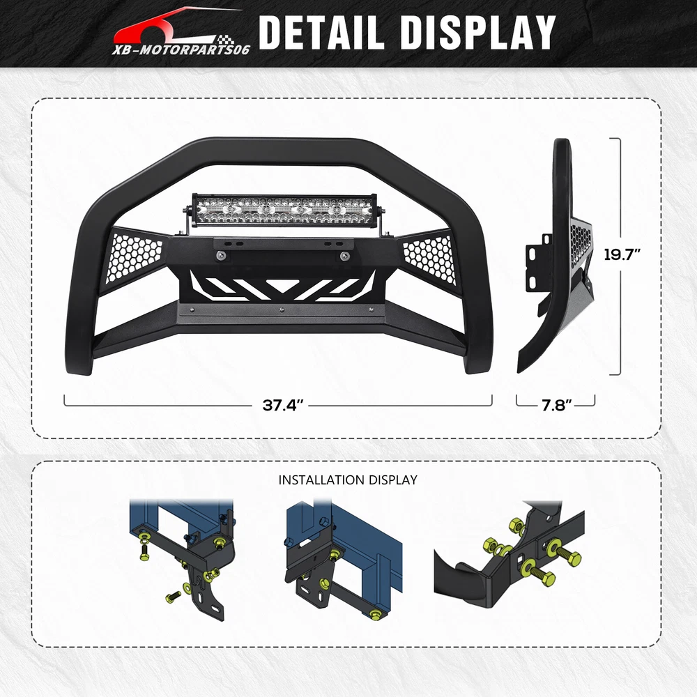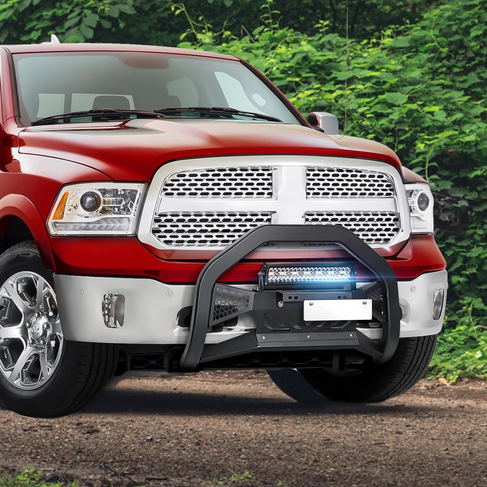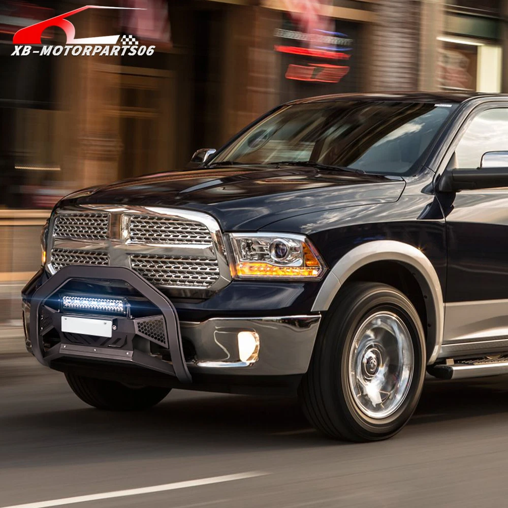 Bull Bar Front Grille Guard Bumper For 09-2018 Dodge Ram 1500 & 19-2024 Classic Please Note that this bull bar may interfere with front-end sensors. Suitable Models : Compatible with 2009-2018 Dodge Ram 1500 & 2019-2024 RAM 1500 Classic ( This won't fit 2019-UP RAM 1500 New Body Style & Rebel/Warlock/Sport Models ) Package Includes : 1 x Long Led Light Bars, 1 x Front Bull Bars, 1 x License Plate Frame Product Information : Product Dimensions : 37.4'' x 7.8'' x 19.7'' Installation mode: Bolt-On With Sensor Holes: No Placement on Vehicle: Front Item Weight: 30.14 Pounds Material: Carbon Steel Color: Black (hand measurements may have an error of 2-3 mm/0.078-0.118 in) Feature : ① Our grille guard comes with 312W long LED light bars and a license plate frame, providing additional lighting for night driving without the need for extra purchases. Our design features pre-drilled slots and holes, allowing for easy removal or replacement if desired; ② Our brush guards feature a special dual-side mesh design and an aggressive-looking logo on the Skid plate. The Skid plate is also removable, adding to the vehicle's wild appearance; ③ Constructed from square carbon steel with a black powder-coated surface, our Bumper Push Bar offers enhanced rust resistance and durability; ④ Direct bolt-on installation using factory holes. Removal of the lower air dam from the front bottom is required, or a slight cutting of the air dam may be necessary ; Warranty Period :2 year Standard Shipping (FedEx Ground or FedEx Home Delivery) Will usually ship within 3 business days of receiving cleared payment Please Note that this bull bar may interfere with front-end sensors. Suitable Models : Compatible with 2009-2018 Dodge Ram 1500 & 2019-2024 RAM 1500 Classic ( This won't fit 2019-UP RAM 1500 New Body Style & Rebel/Warlock/Sport Models ) Package Includes : 1 x Long Led Light Bars, 1 x Front Bull Bars, 1 x License Plate Frame Product Information : Product Dimensions : 37.4'' x 7.8'' x 19.7'' Installation mode: Bolt-On With Sensor Holes: No Placement on Vehicle: Front Item Weight: 30.14 Pounds Material: Carbon Steel Color: Black (hand measurements may have an error of 2-3 mm/0.078-0.118 in) Feature : ① Our grille guard comes with 312W long LED light bars and a license plate frame, providing additional lighting for night driving without the need for extra purchases. Our design features pre-drilled slots and holes, allowing for easy removal or replacement if desired; ② Our brush guards feature a special dual-side mesh design and an aggressive-looking logo on the Skid plate. The Skid plate is also removable, adding to the vehicle's wild appearance; ③ Constructed from square carbon steel with a black powder-coated surface, our Bumper Push Bar offers enhanced rust resistance and durability; ④ Direct bolt-on installation using factory holes. Removal of the lower air dam from the front bottom is required, or a slight cutting of the air dam may be necessary ; Warranty Period :2 year