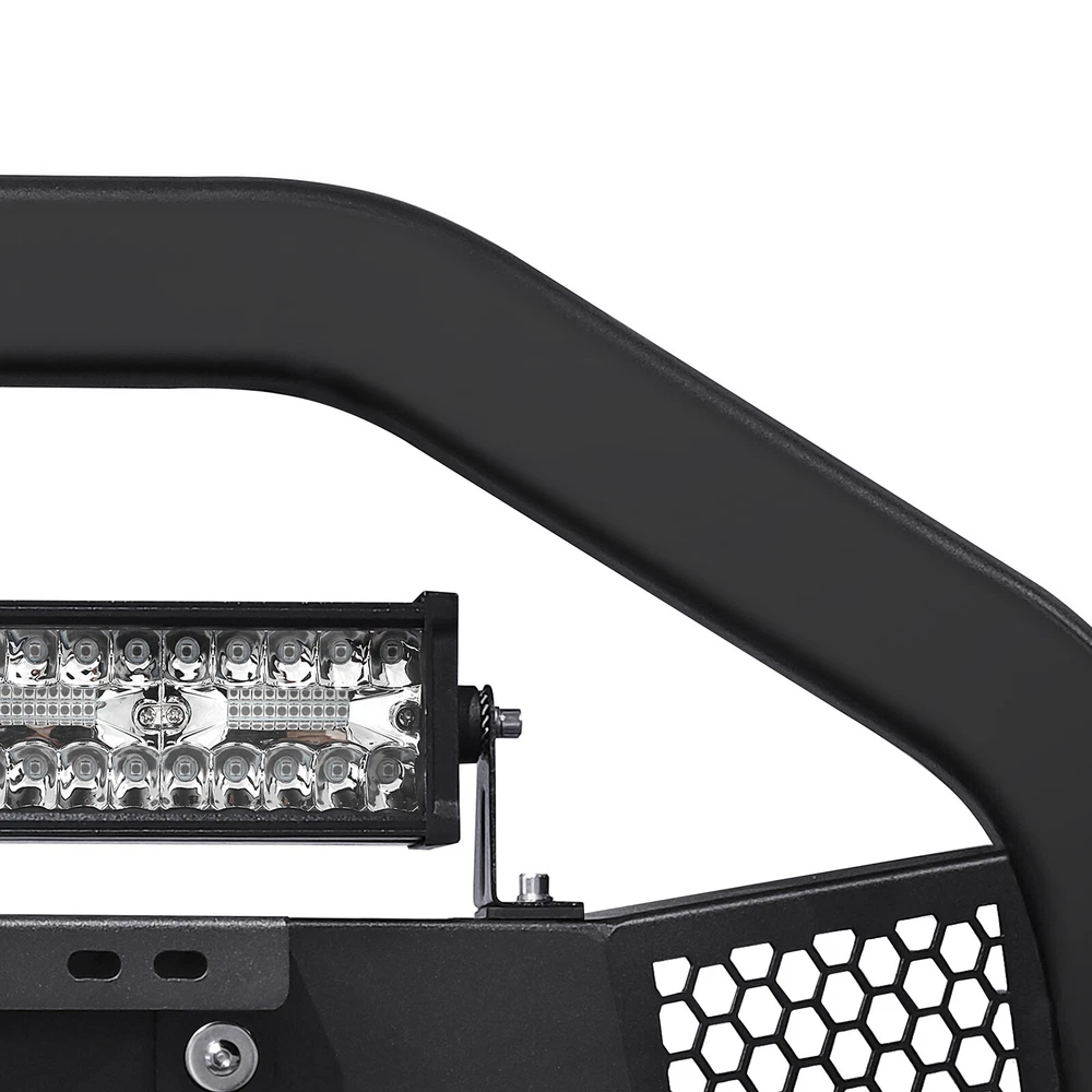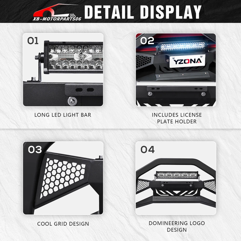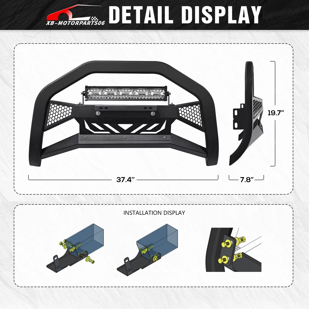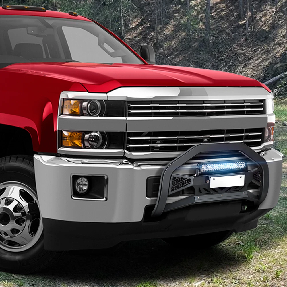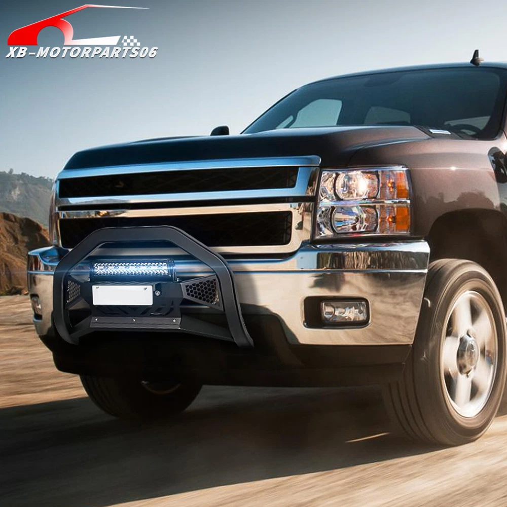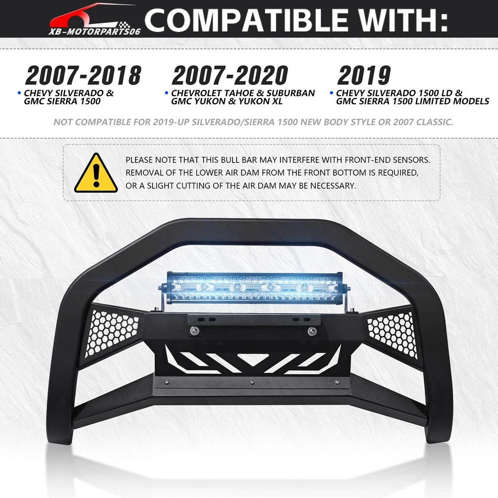 Bull Bar Front Grille Guard Bumper For 2007-2018 Chevy Silverado&GMC Sierra 1500 Please Note that this bull bar may interfere with front-end sensors. Suitable Models : Compatible with 2007-2018 Chevy Silverado & GMC Sierra 1500 / 2007-2020 Chevrolet Tahoe & Suburban / 2007-2020 GMC Yukon & Yukon XL / 2019 Chevy Silverado 1500 LD & GMC Sierra 1500 Limited models ( NOT Compatible for 2019-up Silverado/Sierra 1500 New Body Style or 2007 Classic . ) Package Includes : 1 x Long Led Light Bars, 1 x Front Bull Bars, 1 x License Plate Frame Product Information : Product Dimensions : 37.4'' x 7.8'' x 19.7'' Installation mode: Bolt-On With Sensor Holes: No Placement on Vehicle: Front Item Weight: 27.06 Pounds Material: Carbon Steel Color: Black (hand measurements may have an error of 2-3 mm/0.078-0.118 in) Feature : ① Our grille guard comes with 312W long LED light bars and a license plate frame, providing additional lighting for night driving. Our design features pre-drilled slots and holes, allowing for easy removal or replacement if desired ; ② Our brush guards feature a special dual-side mesh design and an aggressive-looking logo on the Skid plate. The Skid plate is also removable, adding to the vehicle's wild appearance; ③ Constructed from square carbon steel with a black powder-coated surface, our Bumper Push Bar offers enhanced rust resistance and durability. The seamless welding ensures a sturdy structure; ④ Direct bolt-on installation using factory holes. Removal of the lower air dam from the front bottom is required, or a slight cutting of the air dam may be necessary ; Warranty Period :2 year Standard Shipping (FedEx Ground or FedEx Home Delivery) Will usually ship within 3 business days of receiving cleared payment Please Note that this bull bar may interfere with front-end sensors. Suitable Models : Compatible with 2007-2018 Chevy Silverado & GMC Sierra 1500 / 2007-2020 Chevrolet Tahoe & Suburban / 2007-2020 GMC Yukon & Yukon XL / 2019 Chevy Silverado 1500 LD & GMC Sierra 1500 Limited models ( NOT Compatible for 2019-up Silverado/Sierra 1500 New Body Style or 2007 Classic . ) Package Includes : 1 x Long Led Light Bars, 1 x Front Bull Bars, 1 x License Plate Frame Product Information : Product Dimensions : 37.4'' x 7.8'' x 19.7'' Installation mode: Bolt-On With Sensor Holes: No Placement on Vehicle: Front Item Weight: 27.06 Pounds Material: Carbon Steel Color: Black (hand measurements may have an error of 2-3 mm/0.078-0.118 in) Feature : ① Our grille guard comes with 312W long LED light bars and a license plate frame, providing additional lighting for night driving. Our design features pre-drilled slots and holes, allowing for easy removal or replacement if desired ; ② Our brush guards feature a special dual-side mesh design and an aggressive-looking logo on the Skid plate. The Skid plate is also removable, adding to the vehicle's wild appearance; ③ Constructed from square carbon steel with a black powder-coated surface, our Bumper Push Bar offers enhanced rust resistance and durability. The seamless welding ensures a sturdy structure; ④ Direct bolt-on installation using factory holes. Removal of the lower air dam from the front bottom is required, or a slight cutting of the air dam may be necessary ; Warranty Period :2 year