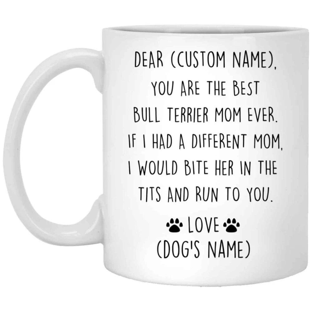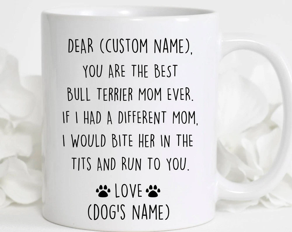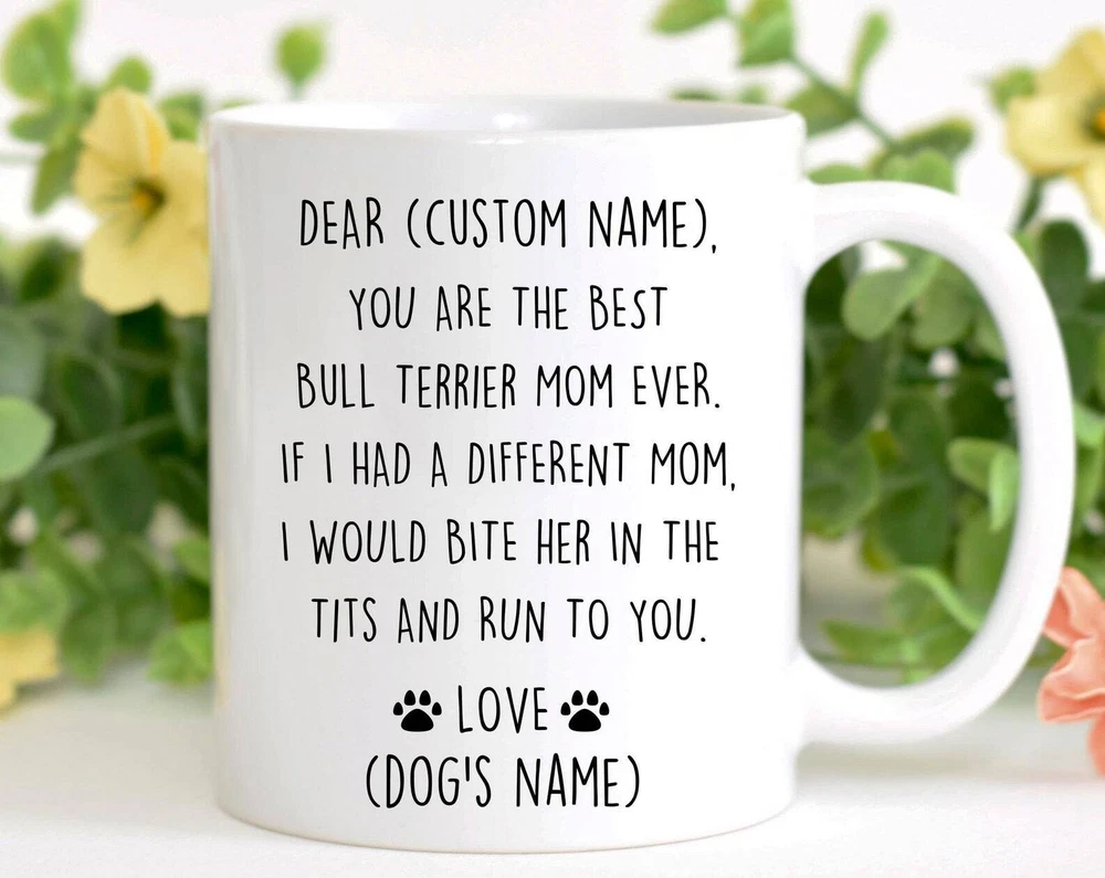Bull Terrier Mom Birthday Gift Bull Terrier Mom Christmas Gift English Bully Mom Valentine Gift Bully Mom Appreciation New Bully Mom Mug Product Details.. This high quality 11oz. ceramic white mug has a premium hard coat that provides crisp and vibrant color reproduction sure to last for years. Perfect for all hot & cold beverages. The highest quality printing possible is used. It will never fade no matter how many times you wash it. Material: 100% Ceramic. Print both sides. Dishwasher and Microwave Safe. High Gloss + Premium White Finish. Printed in the U.S.A. Personalized & Custom. We support personalized and custom mug to add custom, when placing an order, you can add notes to the "order note" in shipping address section. Also you can contact us directly via message. Shipping Info. Ready to ship in 1 to 2 business days, All products are made-to-order and proudly printed in the United States. Shipped by USPS and DHL, You will receive your order in 5-7 days. Replace & Refund. All products are defective during shipping broken, chipped will be replaced free of charge. You are not satisfied with the product, we will refund 100% money to you. If any other issues arise, please do not hesitate to message, we would be more than happy to assist you.