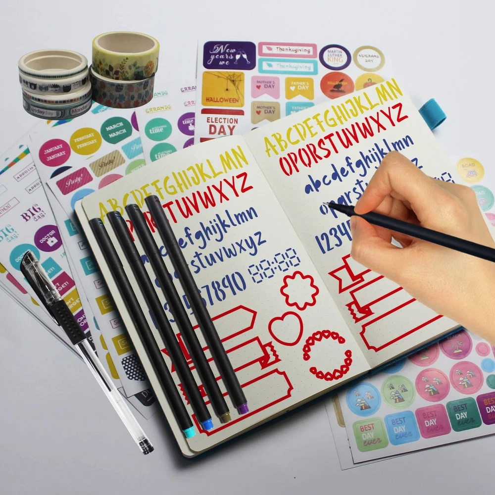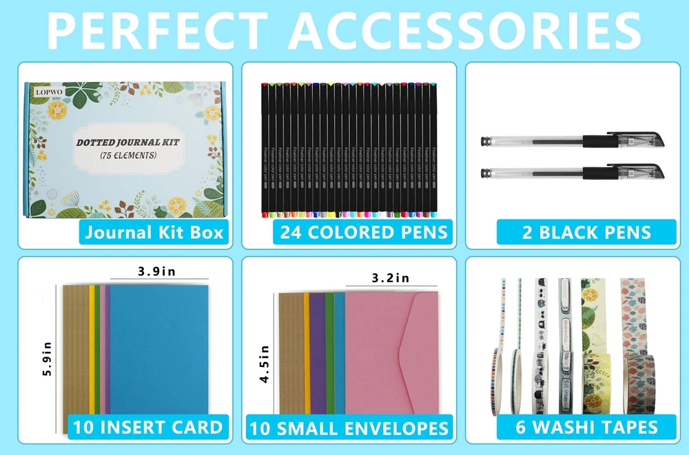 1 Dotted Hardcover Notebook: The faux leather point journal has 192 Numbered pages and size is 5.8”x 8.3”. The premium thick and acid-free dotted paper ensures resistant to bleeding and ghosting. It includes an Elastic Closure,1 Pen Holder Loop,2 Bookmarks,1 Back Pocket with humanized fillet design. 6 Washi Tapes and 10 Mini Envelopes with 10 Insert Card: 6 cute washi tapes in 3 sizes (0.3cm, 0.8cm and 1.5cm), these decorative tapes are perfect for adding color and small element to bullet dotted journal. 10 small envelopes and insert cards makes your journaling lots of fun. 24 Fineliner Pens and 2 Black Pens: 24 unique vibrant colored pens are best for dotted journal drawing, sketching and coloring. 2 black pens (0.5mm) are good for daily writing. 10 Reusable Stencil and 12 Sticker Sheets: 10 reusable journal stencils are durable and flexible, confirm to your A5 dot grid perfectly. 12 beautiful, fun planner stickers ensure your work finishing more attractive. Perfect Dot Journal Kit: The stationary set packed with a elegant box keep your energy active, various accessories support your life more colorful. It's also a best Christmas gift for women and men, teen boys and girls.