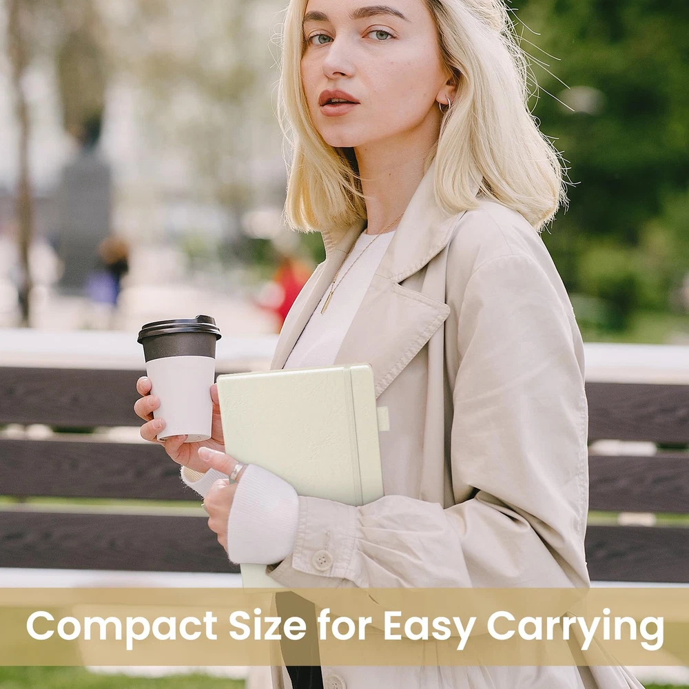 160 Pages Dotted Journal: Discover the freedom of 5mm-spaced dotted pages, perfect for bullet journaling, sketching, and organizing. The subtle dot grid provides structure without limiting creativity, helping you easily design layouts, track goals, and develop ideas in your personal style. Perfect for Creative Planning: Taja dotted journal is ideal for those who love crafting custom planners, creating mood boards, or organizing thoughts freely. It’s a versatile tool for artists, students, professionals, and anyone looking to visualize projects, tasks, and ideas with precision. Premium 100gsm Paper: Made with high-quality 100gsm paper, Taja harccover dotted journal offers a smooth, enjoyable writing experience with no ink bleed-through. Whether you're using pens, pencils, or markers, the durable paper ensures clean and crisp lines, preserving your work beautifully. Portable Size with Handy Extras: Sized at 5.7"x8.6", this medium A5 notebook is compact enough for easy carrying while still providing ample space for your creativity. The faux leather cover, expandable inner pocket, ribbon bookmark, and pen holder offer style and practicality for daily use. Lay-Flat Design for Seamless Writing: The 180° lay-flat binding makes it effortless for both left- and right-handed users to write, draw, or sketch without any interruptions. With a perfectly flat surface, this notebook enhances your creative flow on any surface.