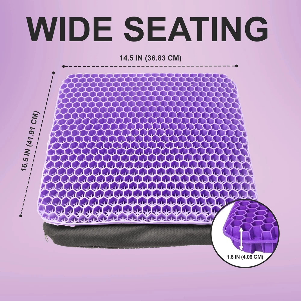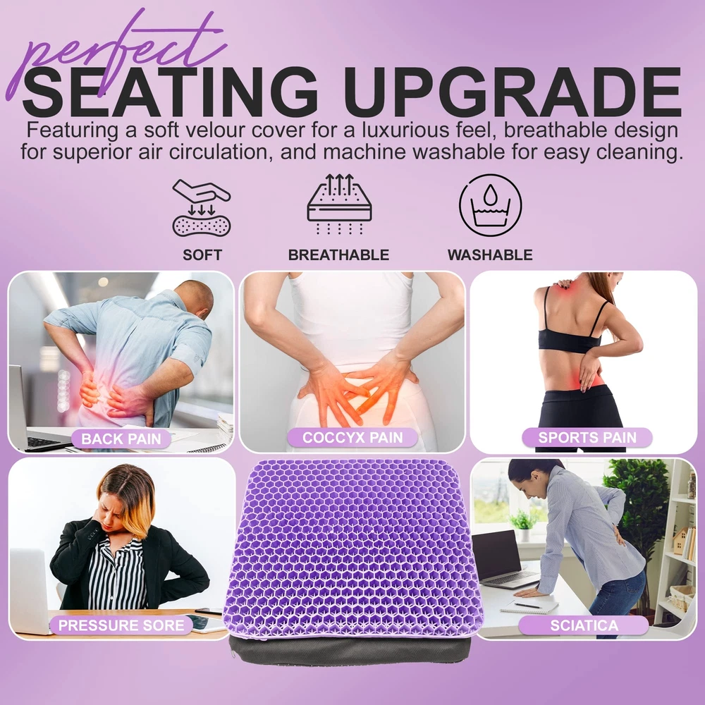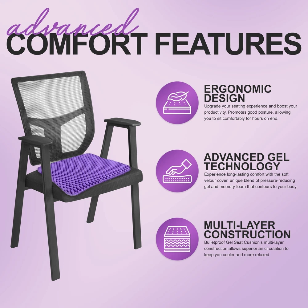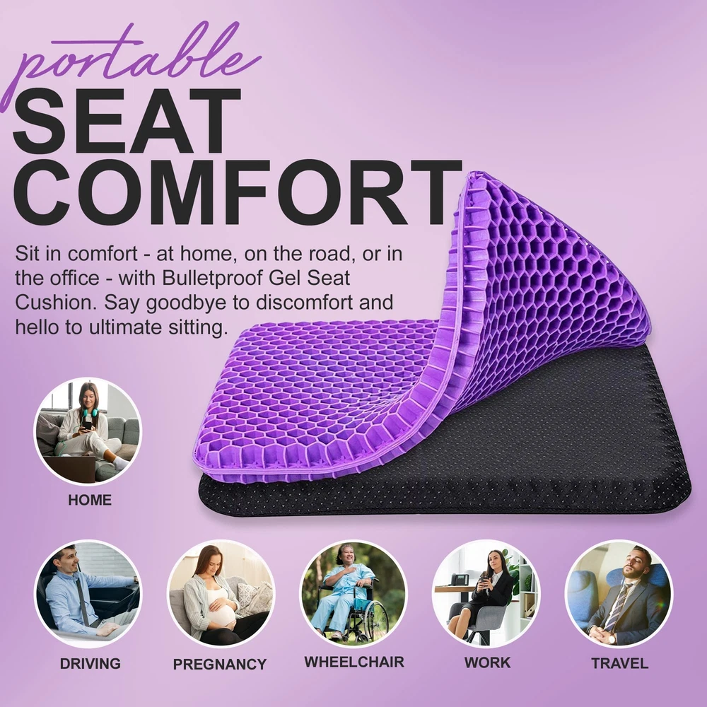 COMFORT & PRESSURE RELIEF: Bulletproof's Gel Seat Cushion provides advanced comfort and long-lasting pressure relief with its double gel layers, seat pillows and egg-crate foam design. Perfect for use in wheelchairs, cars, traveling or the office. PORTABLE & WASHABLE: Secure your cushion with its non-slip rubber bottom to keep it in place while you use it. Easily clean it, as well, with its machine-washable zippered velour cover! POSTURE HEALTH: Ergonomically designed to provide maximum support and comfort while reducing pressure on the coccyx/tailbone, promoting healthy posture. An ideal seat cushion for long sitting sessions! RELIEF FROM BACK PAIN - Enjoy improved comfort and support with our Bulletproof Gel Seat Cushion! Its unique blend of pressure-reducing gel and memory foam contours to the body. Plus, its multi-layer construction allows superior air circulation to keep you cooler and more relaxed. FOR ULTIMATE SITTERS: This Gel Seat Cushion is the perfect cushion for ultimate sitters, such as those that work long hours at their desk, truck drivers, wheeling users and airplane travelers. With its advanced materials and design, it successfully removes the stress from any hard sitting surface.