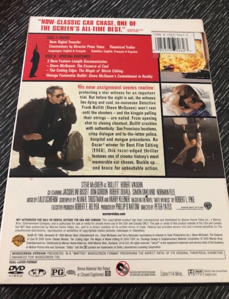 Genre:ActionActor:ActionSub-Genre:ChaseLanguage:EnglishType:MovieFeatures:Behind The Scenes FeaturetteFormat:DVDDirector:Peter YatesStudio:Warner Home VideoMovie/TV Title:BullittRating:PGEdition:Special Edition