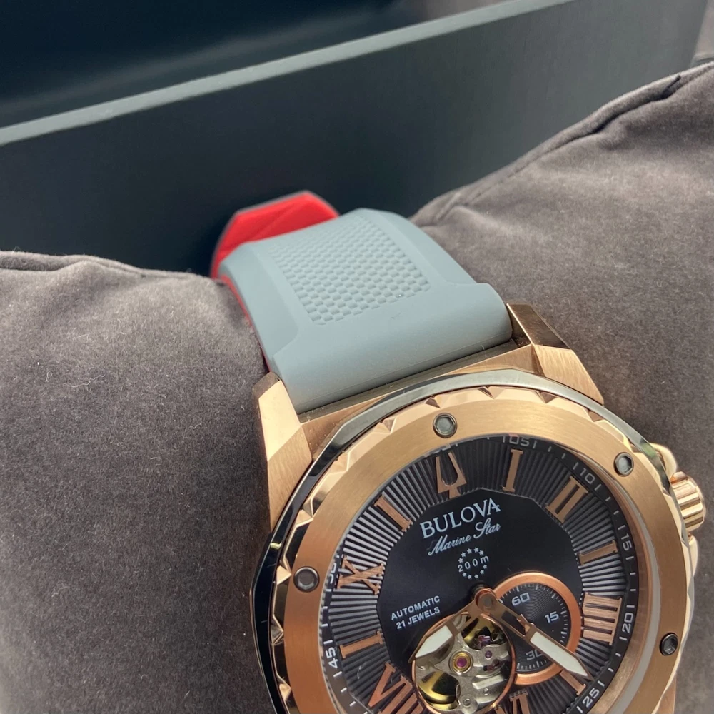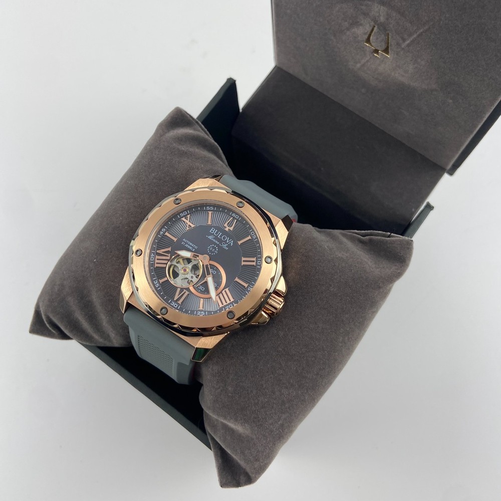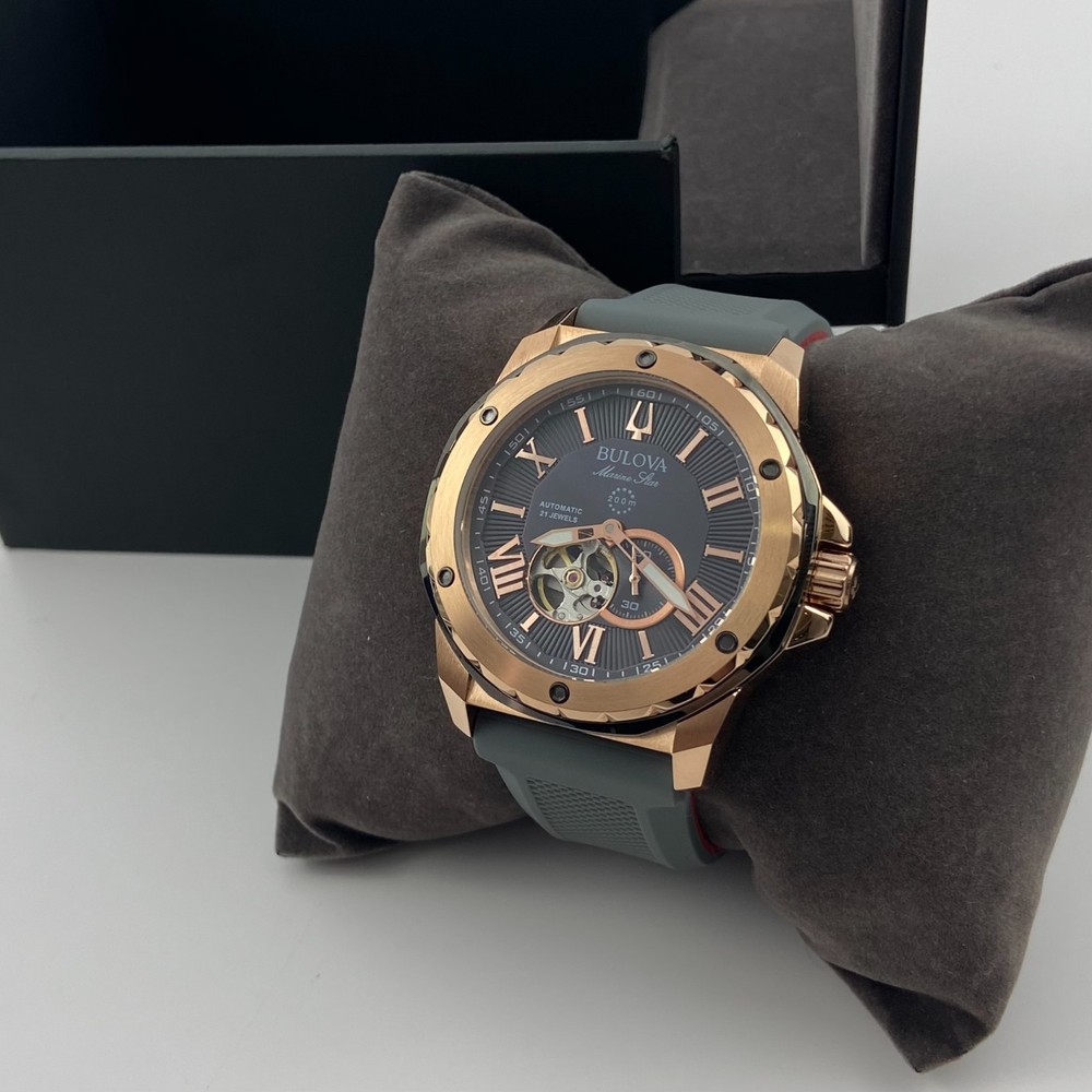Bulova 98A228 Marine Star Grey Dial Grey Rubber Strap Men's Automatic Watch 45mm Description Discover the men's Marine Star featuring a three-hand automatic movement showcased in an open aperture. A rose gold-tone stainless steel case with grey outer ring offers a nautical inspired look. The grey dial is paired with a grey textured silicone strap with a contrasting red underside. Water resistance to 200 metres. Product Details Band: Grey Silicone Strap with Pin Buckle Case: Rose Gold Tone Stainless Steel Functions: 3 Hand Dial Colour: Grey Case Size (MM): 45MM Crystal: Mineral Crystal Water Resistance: 200 Metres Friendly Reminder: 📧 Emails are usually replied to within 24 hours . If you have any questions, please feel free to leave a message. 🚚 If you need to receive your package as soon as possible, please leave a note when placing your order or contact me by email. I can upgrade the shipping to UPS 2nd Day Air or other faster shipping options when available. Looking forward to a smooth transaction with you. Thank you for your support!