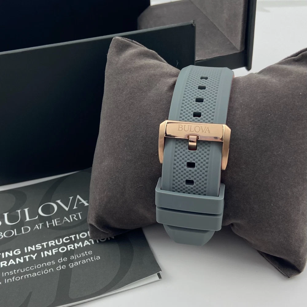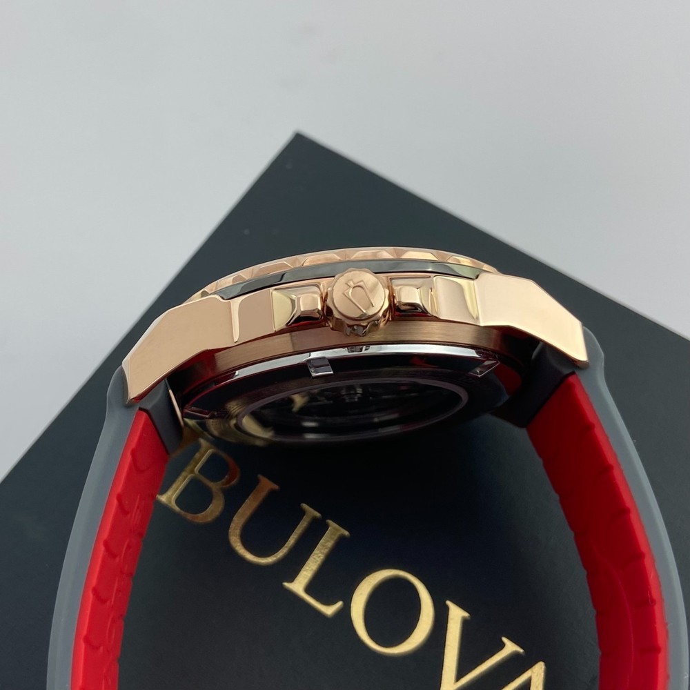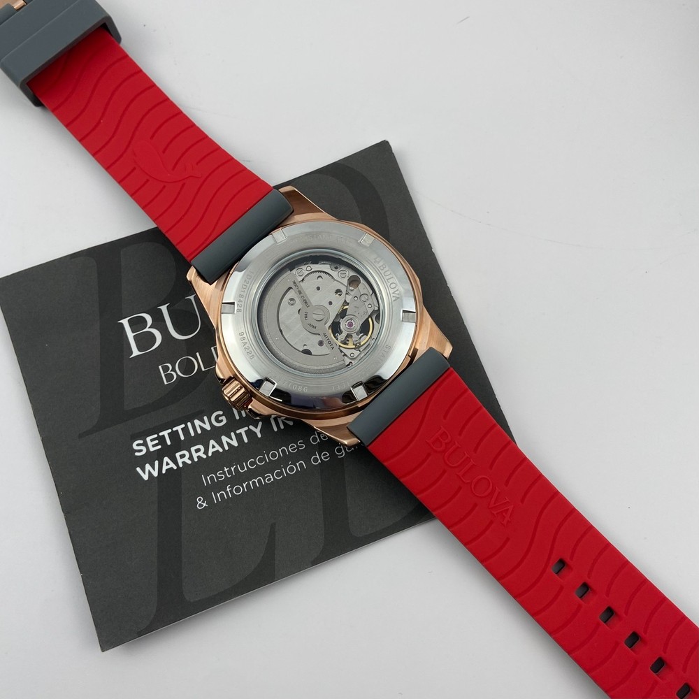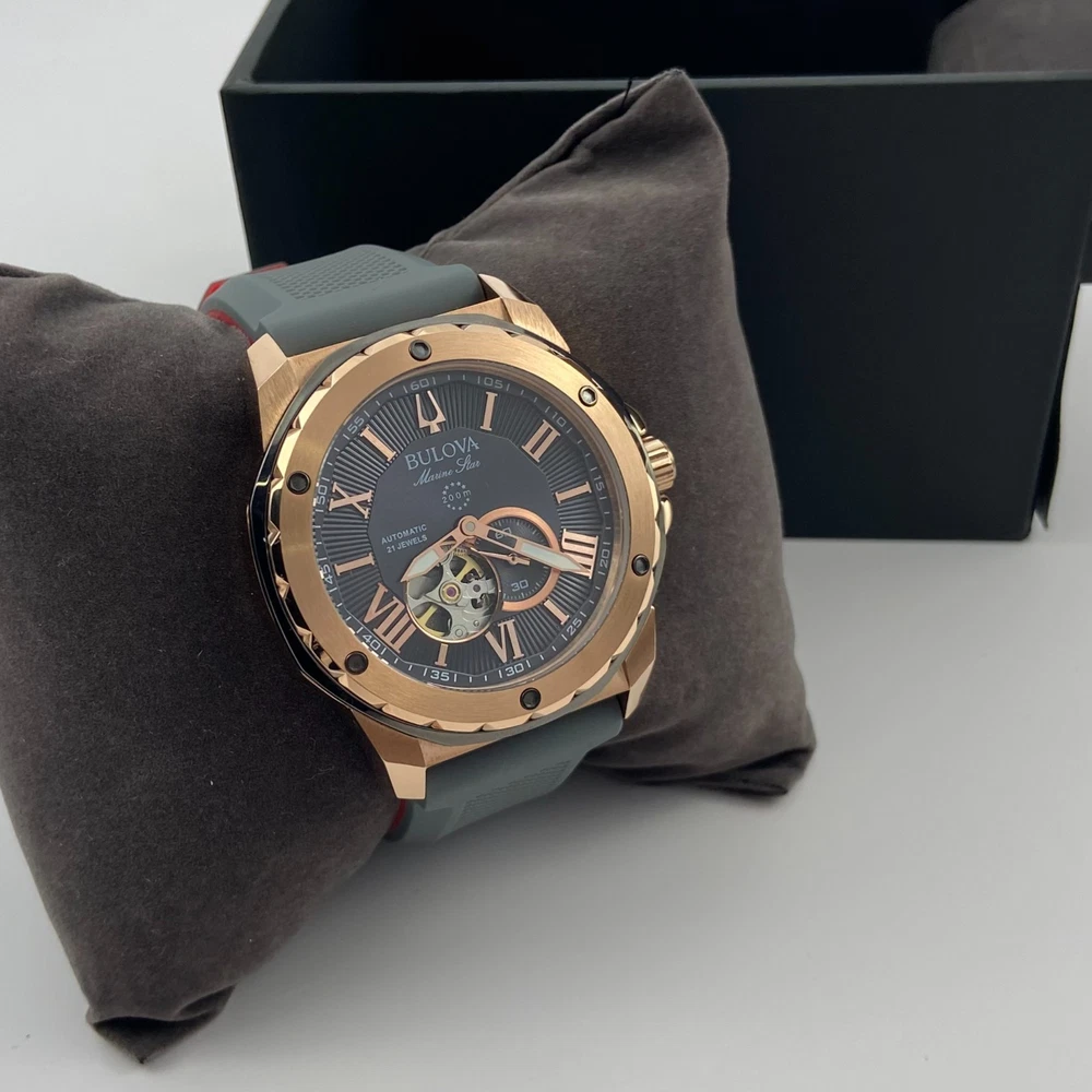 Bulova 98A228 Marine Star Grey Dial Grey Rubber Strap Men's Automatic Watch 45mm Description Discover the men's Marine Star featuring a three-hand automatic movement showcased in an open aperture. A rose gold-tone stainless steel case with grey outer ring offers a nautical inspired look. The grey dial is paired with a grey textured silicone strap with a contrasting red underside. Water resistance to 200 metres. Product Details Band: Grey Silicone Strap with Pin Buckle Case: Rose Gold Tone Stainless Steel Functions: 3 Hand Dial Colour: Grey Case Size (MM): 45MM Crystal: Mineral Crystal Water Resistance: 200 Metres Friendly Reminder: 📧 Emails are usually replied to within 24 hours . If you have any questions, please feel free to leave a message. 🚚 If you need to receive your package as soon as possible, please leave a note when placing your order or contact me by email. I can upgrade the shipping to UPS 2nd Day Air or other faster shipping options when available. Looking forward to a smooth transaction with you. Thank you for your support!