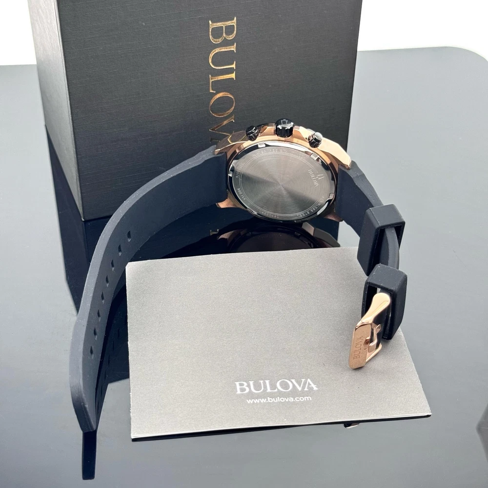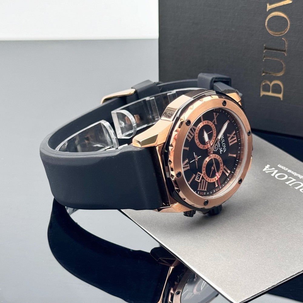 From Bulova's Men's Marine Star Collection, live and play in maritime watches that feature bold accents, iconic patterns and innovative materials inspired by the sea.Round black patterned dial with luminous hands and rose gold-tone Roman numerals makes reading easy. Details: Chronograph subdials track minutes and hours. Two-Tone Stainless Steel Water resistant to 330 feet Date function Chronograph, Calendar 12/24-hour format Quartz movement Battery operated Mineral-crystal face cover Rose gold-tone ion-plated stainless steel case with black accents Stainless steel caseback Adjustable black band Manufacturer's 3-year limited warranty Model no. 98B104 Shipping: All items will be shipped within 2 days upon receipt of payment (except weekends and holidays). If Payments are received on weekends or holidays, goods will be shipped on the following business day. Buyer confirms (offers) address & Phone number after order item.If you need to change your address after placing an order, please contact me. We offer expedited service. If you need, please contact us. Returns: We support a 30-day return and exchange policy. If you are not satisfied with the product you received, you can contact us for a return or exchange. In order to be a full refund, less shipping expenses, your returned merchandise must be in its original new condition, as shipped, with all packaging, manuals, and paperwork intact and unaltered.
