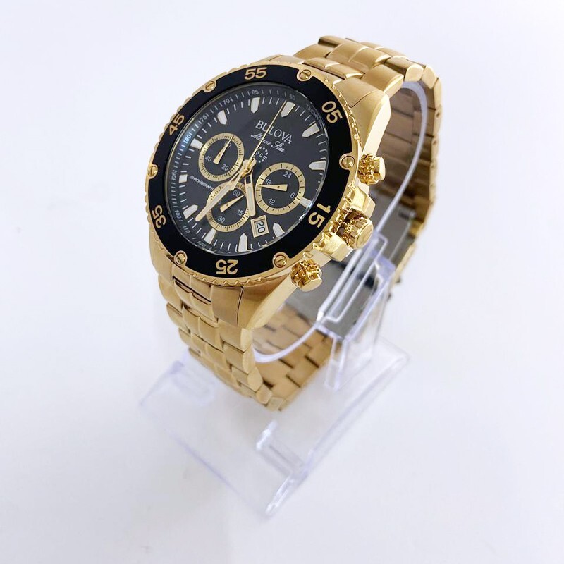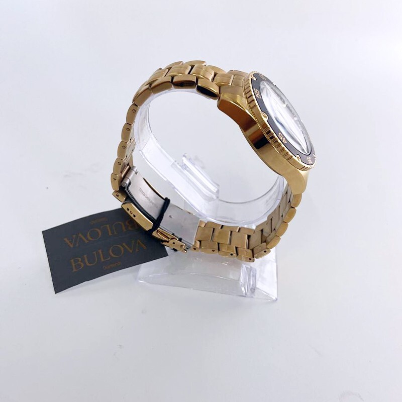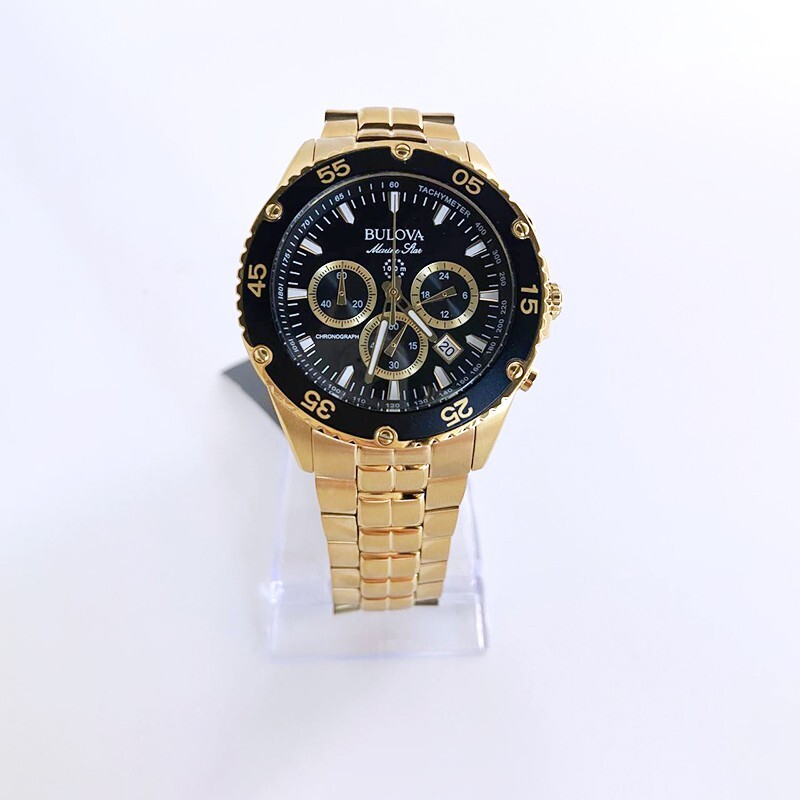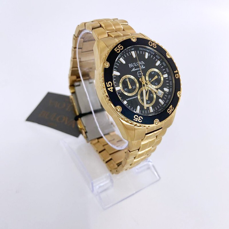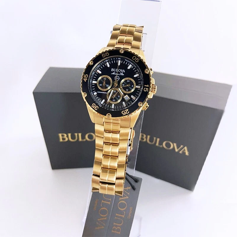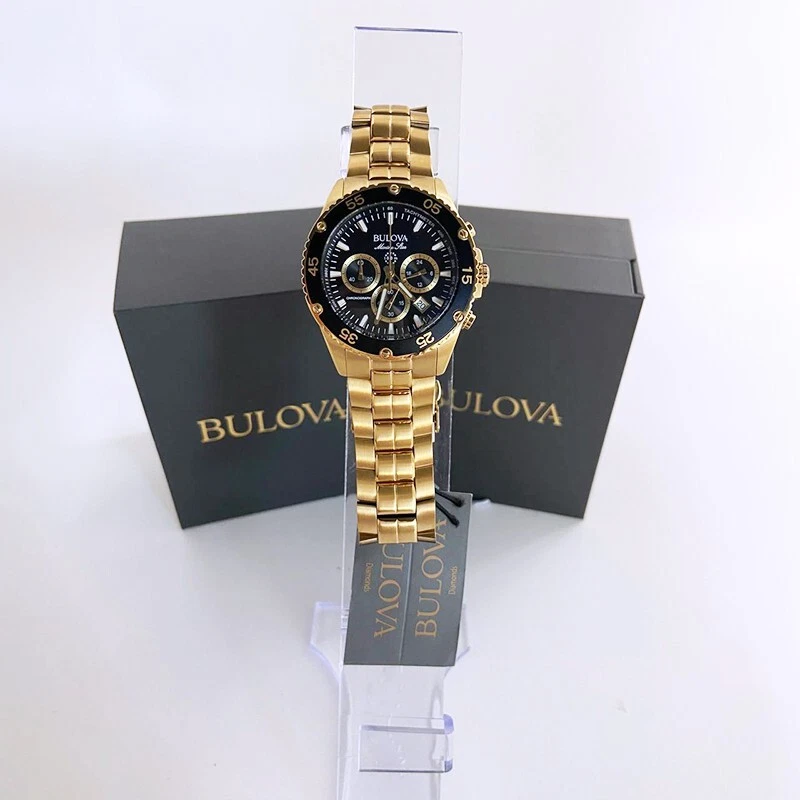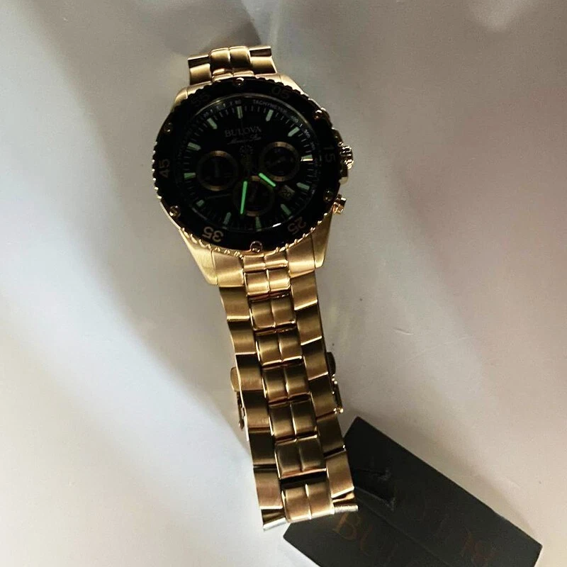 Classic Bulova Gold/Black Marine Star Chronograph Men Quartz 98B406 Watch 41.5mm This Bulova's watches is a striking men's 6-pin chronograph and calendar with exquisite style and exceptional functionality. The gold stainless steel case features a black unidirectional chronograph bezel and domed mineral crystals for extra durability, including 100 meters of water resistance. The dial is a striking black daylight with white and gold accents and illuminated hands and markers. This Ocean Star watch features timing, 24 hours, and a calendar display on the dial, offering utility beyond traditional timepieces. The watch is paired with a gold stainless steel bracelet with live and play in maritime watches that feature bold accents, iconic patterns and innovative materials inspired by the sea. Watch Collection : Marine Star Model: 98B406 Case Width: 41.5mm Lug Width: 22mm Bracelet Width: 20 mm Dial Color: Black Strap Color: Gold Crystal: Mineral Bezel: Fixed Quartz Movement: Automatic Case Material: Stainless Steel Luminous: Hands & Hour Markers Functions: Hour, Minute & Second Bracelet Material: Stainless Steel Clasp Type: Buckle Water Resistant: 100m ( 100 ft ) Features Water Resistance: 100 meters/330 feet Calendar: Date displayed between 4 o'clock and 5 o'clock positions Function: Timer, date, hour, minute, second Watch Features: Chronograph, stainless steel, pointer type Comes with: Gift box for better storage and portability. Transportation: The item will be shipped within 24 hours. Contact: If you have any questions, feel free to contact me at any time I will reply to you as soon as possible.