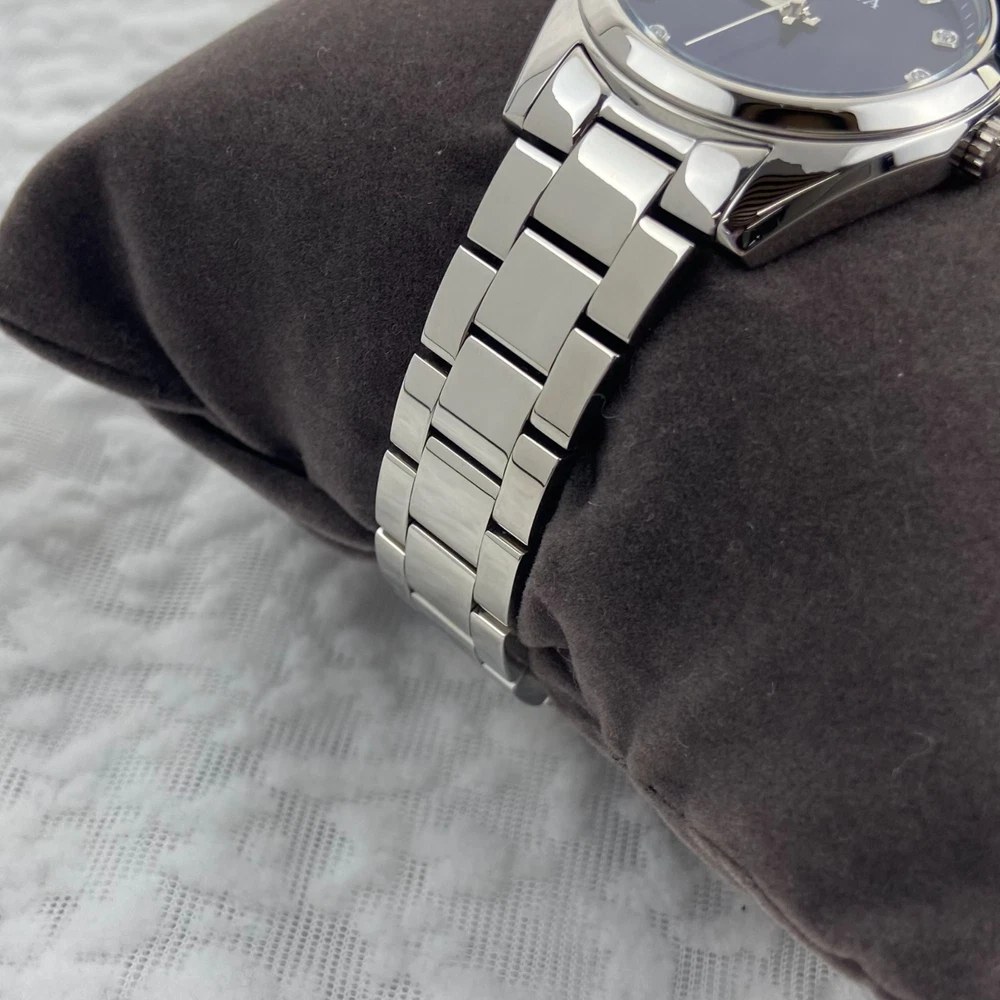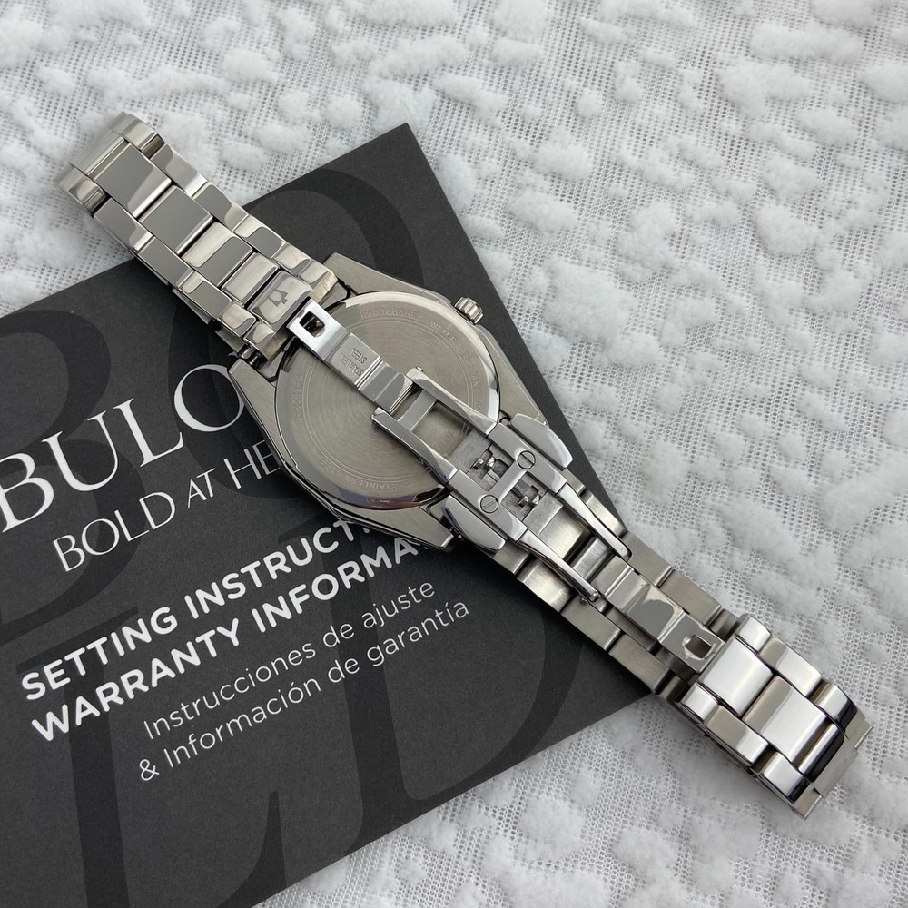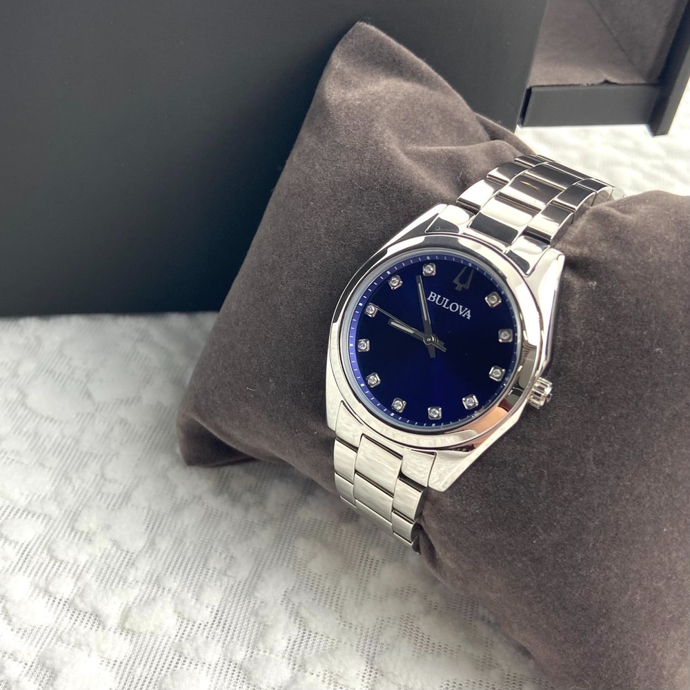 Bulova Surveyor Women's Watch 96P229 Diamond Blue Dial Stainless Steel Strap Description The Surveyor from Bulova is a classic women’s watch that will never go out of style. This silver-tone watch has a stainless steel case and bracelet with a blue three-hand dial hand set with 11 diamonds for both the look and feel of a luxury watch. With beautiful details and an elegant flair, this accessory brings a touch of timeless elegance to any occasion. Specifications Model: 96P229 Dial: Blue; Diamond Accents;Silver Accents Case: 31 mm; Silver-Tone; Stainless Steel Lug: 16 mm Band: Bracelet; Stainless Steel; Deployant Clasp with Push Buttons Crystal: Mineral Crystal; Impact and shatter resistant Water-Resistance: WR [Splash Resistant] Weight (g): 105 Movement: 2035; Quartz A movement powered by a battery. The quartz crystal regulates the time achieving accuracy to 15 seconds a month. Functions: 3 Hand NOTE: Please feel free to email me with any questions, and I will respond within 24 hours. I will do my best to resolve any issues you may have. Kindly avoid leaving neutral or negative feedback without contacting me first. Thank you for your understanding, and I hope you have a pleasant shopping experience!