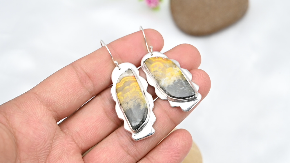 Absolutely love these earrings! The bumble bee jasper has such unique, earthy tones, and the sterling silver setting gives them a sleek, elegant look. They're lightweight, comfortable to wear all day, and the craftsmanship is top-notch. Perfect for adding a natural, bohemian touch to any outfit. Highly recommend!