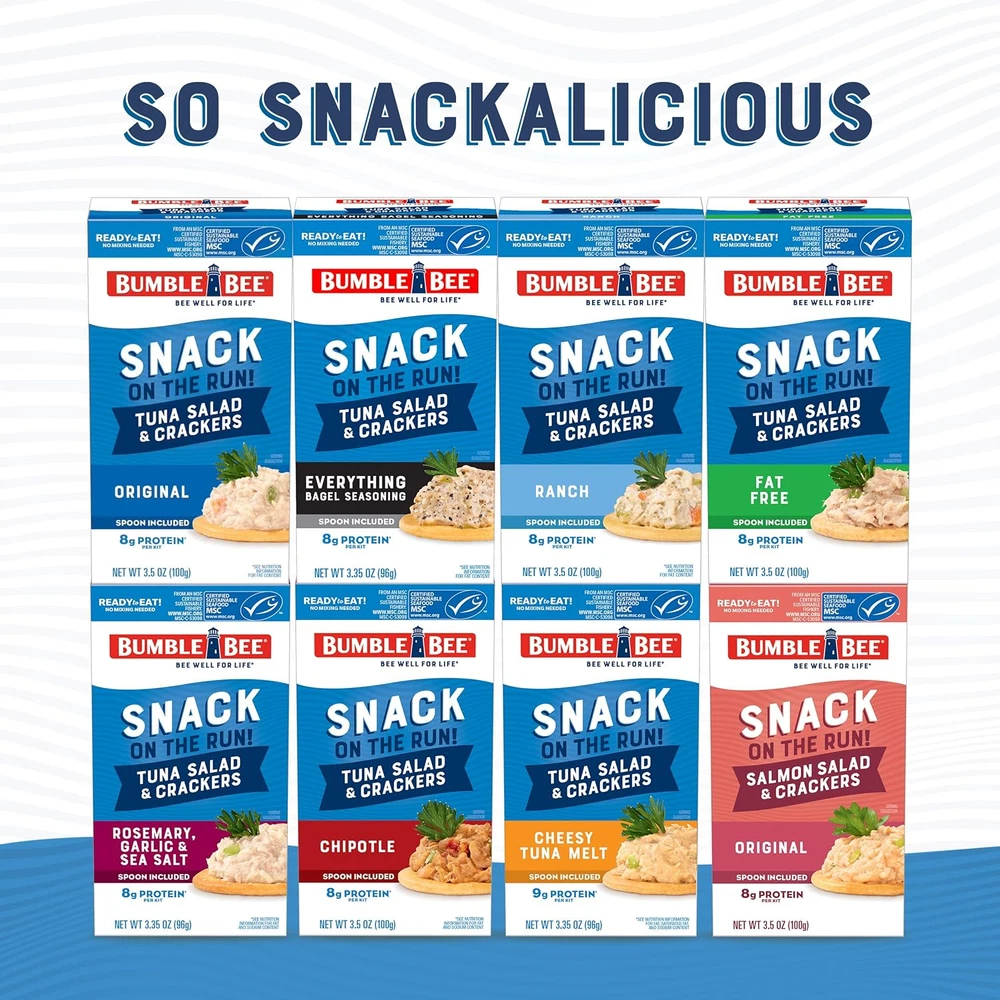 ORIGINAL TUNA SALAD KIT: Each box includes one can of classic premium tuna salad made with wild caught light tuna fish (already mixed and ready to eat), six crackers, and a spoon. PROTEIN IN A HURRY: Tasty flavor-packed tuna salad with buttery crackers is the perfect snack to help you stay satisfied on the run. Contains 8g of protein per kit (1 serving). Bulk case contains twelve kits. SHELF STABLE PANTRY STAPLE: Requires no refrigeration for easy storage at home, and is a quick grab-and-go option for office or school lunch, while traveling, or as a post-workout pick-me-up. Even faster than fast food! ON THE GO: Perfectly sized for your lunchbox or backpack and ready to go wherever life takes you! Great for outdoor activities like picnics, hiking, biking, camping, and sports. SUSTAINABLE TUNA: MSC Certified Sustainable Seafood, Wild Caught, and Dolphin Safe. We get it, you’re really busy. No, like we actually get it. That’s why we made our Bumble Bee Snack on the Run! kits. Because being on the go shouldn’t mean foregoing the finer things in life, like our beautifully filling tuna salad on crackers you can eat straight from the box. The iconic, the classic, the ever-comforting tuna salad, premixed and ready to eat anywhere you want. All you have to do is open the box and dig in.