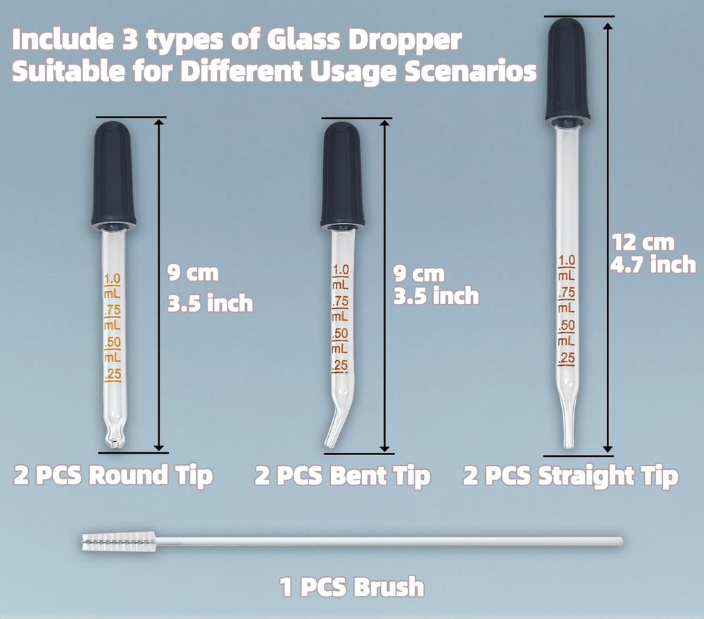 Bundle 6 Pack Glass Pipette Dropper with Brush Bent & Straight 1ml Eye Droppers Product Details Material: ‎Glass Bottle Type: ‎Glass Pipette Dropper Color: ‎clear Capacity: ‎1 Milliliters Special Feature: ‎Leak Proof Product Dimensions: ‎0.48"W x 4.6"H Product Care Instructions: ‎Hand Wash Only Model Name: ‎A-GLASS-DROPPER Recommended Uses For Product: ‎Home, Travel Number of Items: ‎6 Reusability: ‎Reusable Shape: ‎Cylindrical Unit Count: ‎6.0 Count Package Information: ‎Glass Pipette Dropper Specific Uses For Product: ‎Precision Liquid Transfer Item Weight: ‎1.6 Ounces Item Weight: ‎1.6 ounces Item model number: ‎A-GLASS-DROPPER Item Package Quantity: ‎6 Special Features: ‎Leak Proof Included Components: ‎6 Glass Pipette Dropper + 2 Brush Batteries Included?: ‎No Batteries Required?: ‎No High-Quality Material Crafted from durable and safe materials, the ATDCOEK reusable glass dropper ensures longevity and reliability. The glass dropper is resistant to corrosion, making it ideal for Making essential oils, medicines, or craft liquids Easy to Clean Design This eye dropper tool can be effortlessly separated into its components - the glass dropper pipette, and Silicone tip - allowing for thorough cleaning with brush after each use. Simply pull apart gently and clean with ease Strong Suction Power Silicone Tip Featuring a silicone tip that provides superior suction power, this liquid dropper guarantees precise measurement and smooth transfer of liquids without spills or leaks Widely Used Versatile in application, the ATDCOEK glass dropper pipettes is suitable for various purposes such as measuring and transferring oils, ear drops, medicine, crafting supplies, and more. Its your go-to solution for all liquid handling needs Multiuse Applications From skincare routines to DIY projects, this ml dropper for liquids offers endless possibilities. Whether you're using it for cosmetics, health care, or creative crafts, this glass pipette delivers exceptional performance every time