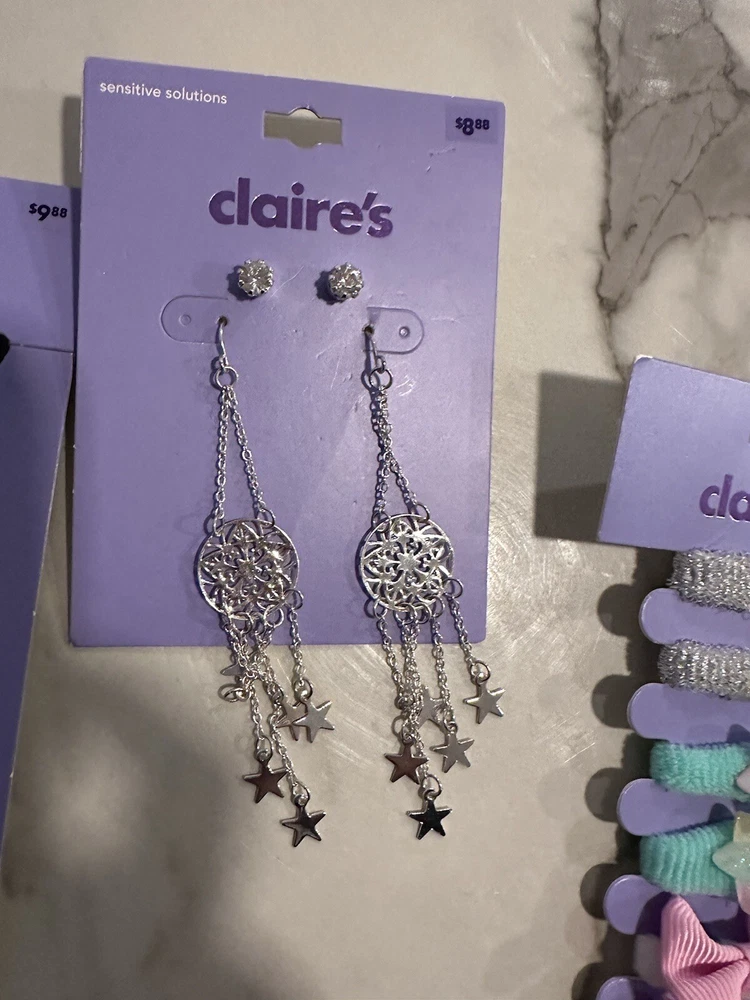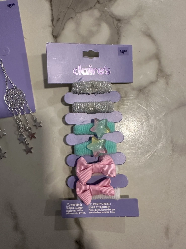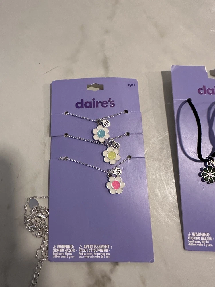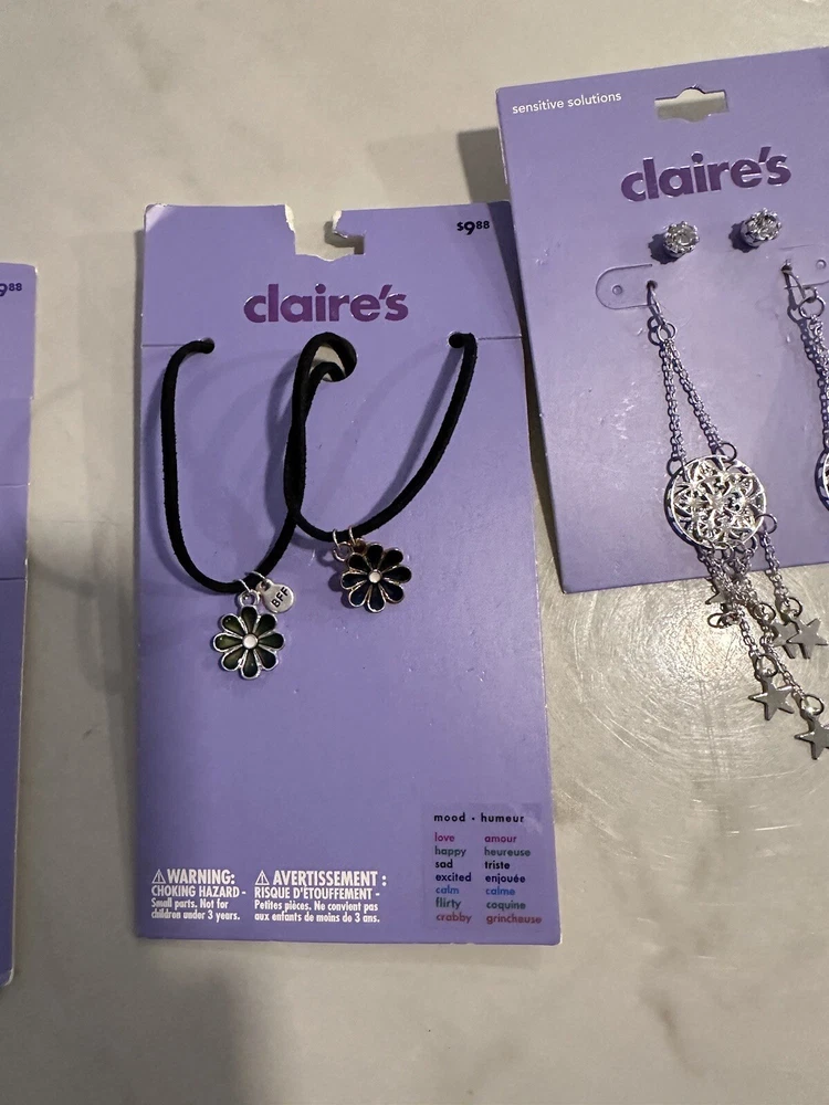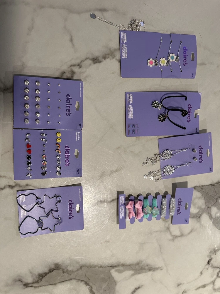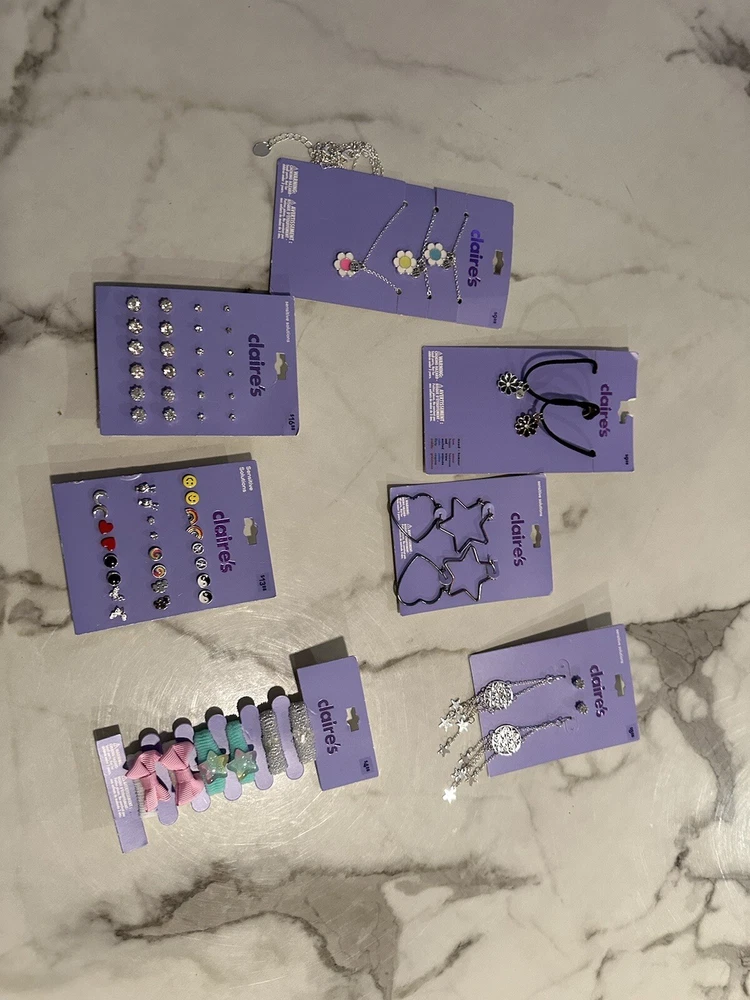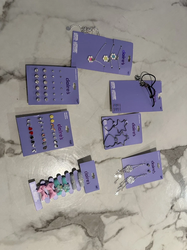 This bundle of 7 Claire's jewelry items includes a mix of earrings, BFF necklaces, rings, and hair accessories. The pieces come in a variety of colors, making it easy to mix and match with different outfits. The brand is known for its trendy and fun designs that appeal to a wide range of fashion tastes. Whether you're looking to add some sparkle to your everyday look or dress up for a special occasion, this bundle has something for everyone SA3