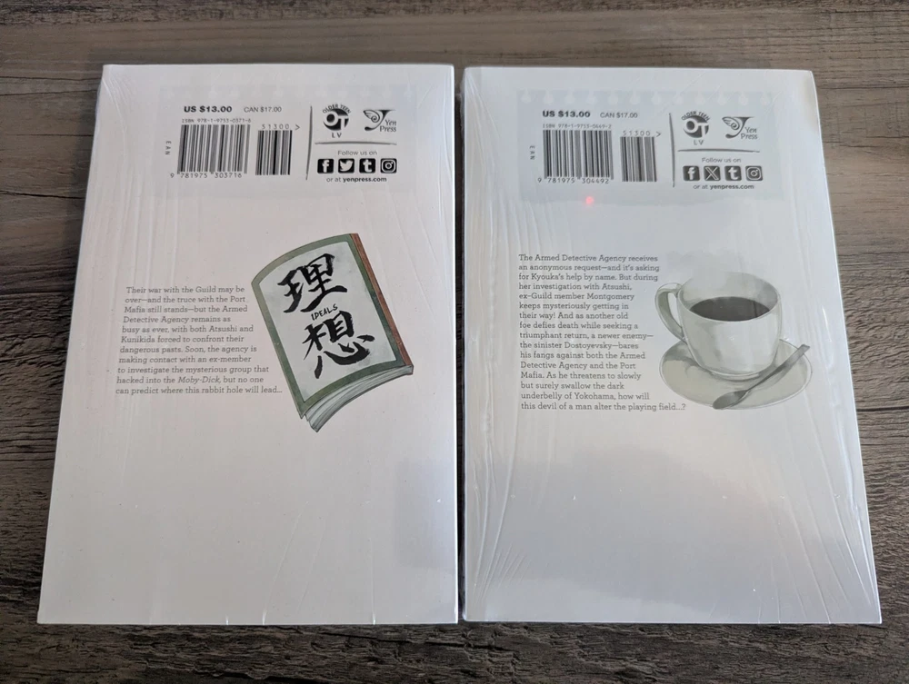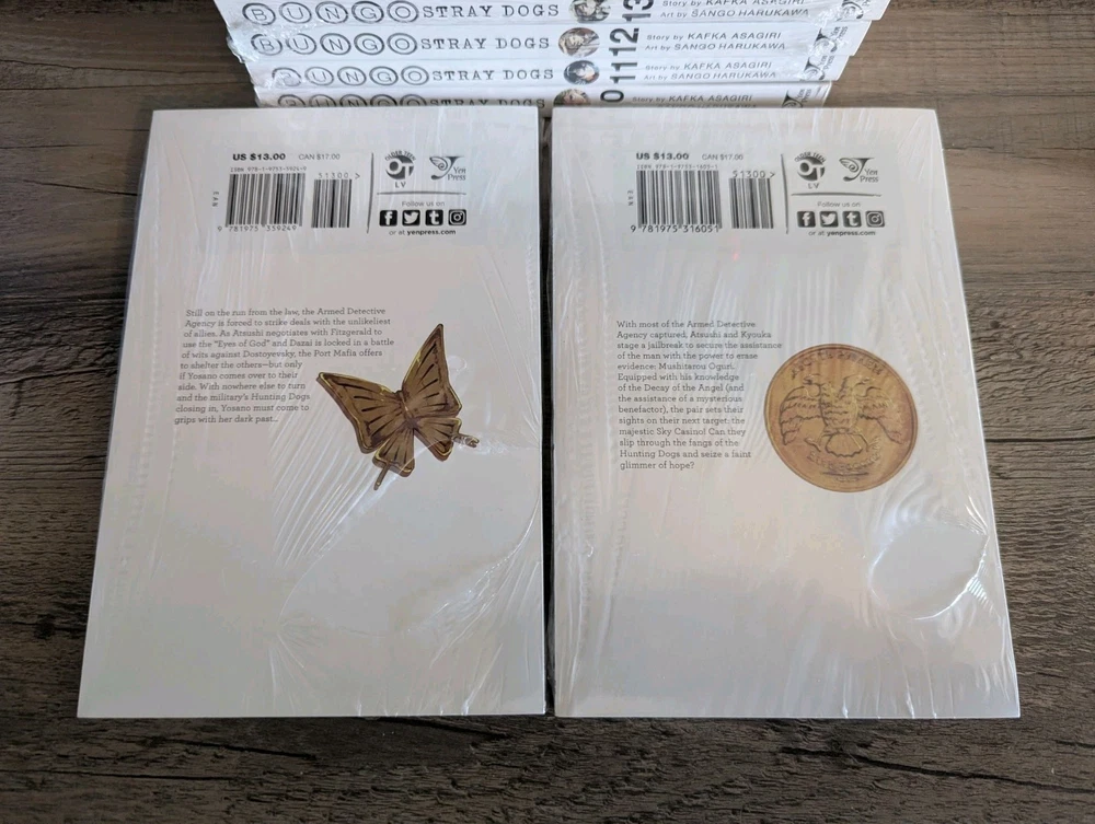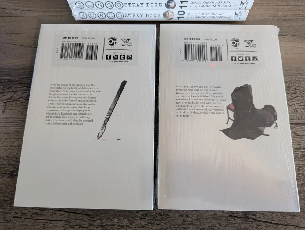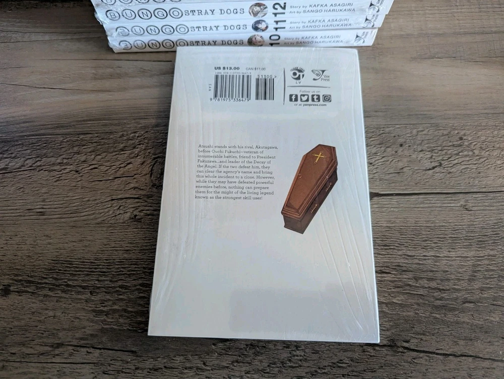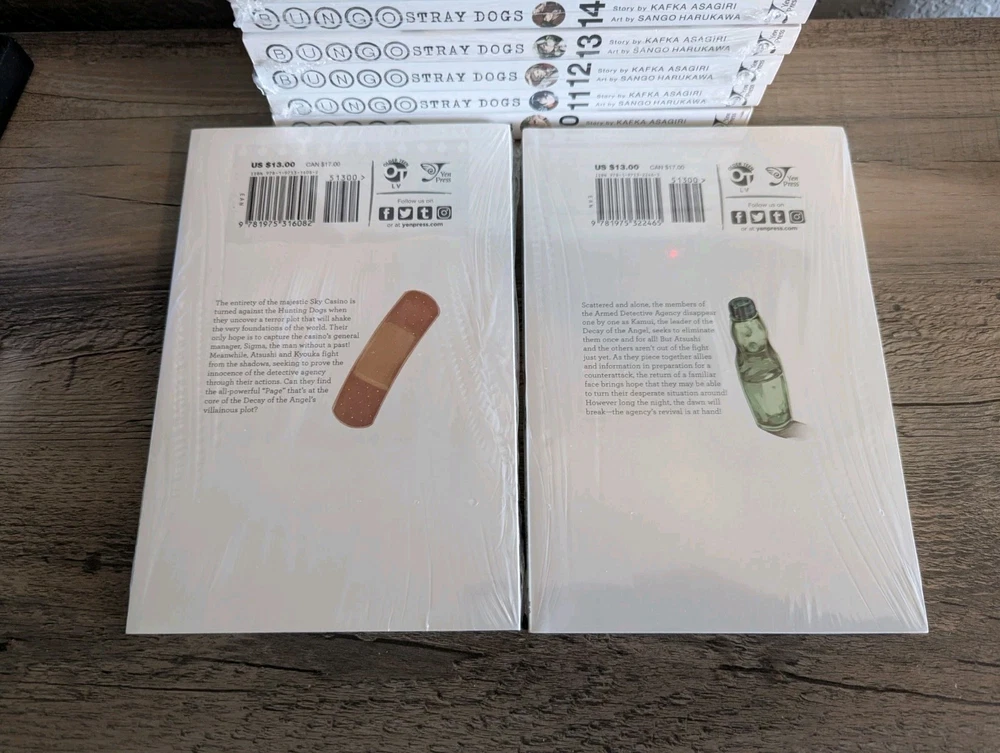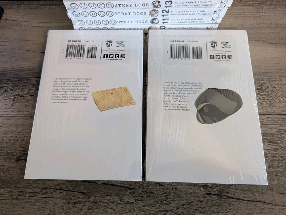 Series: Bungo Stray Dogs Artist / Writer: Kafka Asagiri (Story) ; Sango Harukawa (Art) Genres: Action, Supernatural Demographic: Seinen Volume(s): 10, 11, 12, 13, 14, 15, 16, 17, 18, 19, 20 Complete Series? No Language: English Publisher: Yen Press Rating: Older Teen MSRP: $13.00 per volume ($143.00 for set) Synopsis: Having been kicked out of the orphanage, a despairing young man by the name of Atsushi Nakajima rescues a strange man from a suicide attempt—Osamu Dazai. Turns out that Dazai is part of an armed-detective agency staffed by individuals whose supernatural powers take on a literary bent! -------------------------------------------------------------------------- About Us: Cozy Manga is an online store specializing in graphic novels, manga, light novels, artbooks, and relevant products. As avid fans and collectors ourselves, we bring a curated touch with hand-picked stock and mindful handling. Shipping and Handling: All of our listings come with one business day handling and are shipped directly from our location in Albuquerque, New Mexico, USA. To help protect your purchase during shipping we will always ship your order in either a box or between pieces of cardboard if mailed in a bubble mailer. Quality Controls: All of our books come shrink wrapped. Any volumes that are delivered to us with no factory wrap are personally shrink wrapped once unpacked. While we will strive to shrink wrap volumes as professionally as possible, there may be some imperfections with the shrink wrap. Some volumes may come with minor imperfections or nicks if delivered as such from the publisher. Volumes with bigger imperfections will be listed as such with details. Return Policy: All of our listings come with a 30 day free return policy, including remorse returns. In the event you no longer want an item and wish to return it, item(s) must be received in new condition with their shrink wrap still intact for a full refund. Any items returned opened, used, damaged, or otherwise not in new condition may be subject to a variable refund deduction depending on the state of the item(s) up to 50% per the Ebay Seller Protection Policy. When returning an item, make sure to pack it properly to help prevent damage in transit. We do not offer no-return refunds and refunds will not be issued until we have received your return and inspected it. Returns initiated due to item arriving damaged, doesn't match the listing description, or because it is the wrong item are subject to the Ebay Money Back Guarantee Policy . If we have more of the same item in stock, you may request a replacement or a same value exchange. Cancellation Policy: If you made an order but have changed your mind and want to cancel please use the eBay cancellation request form or send us a message. We will cancel your order and refund you your money no questions asked so long as we have not already shipped it out. If you request a cancellation but your package has already been dropped off with the shipping carrier you will need to initiate a return request once you have received your order. F.A.Q.: Would you be willing to take x amount for this listing? Our listing prices are non-negotiable. We do not accept offers or haggle on price. If you are interested in a listing but would like to buy it at a lower price, please watch the listing to receive future notifications on any sales or discounts that may be offered in the future. I'd like to buy certain volumes from this multi-volume set listing. Would you be willing to split them out? If you need or want only certain volumes out of our set listings, please send a message about what volumes you would like to purchase. Most of the time we are more than willing to accommodate your request!