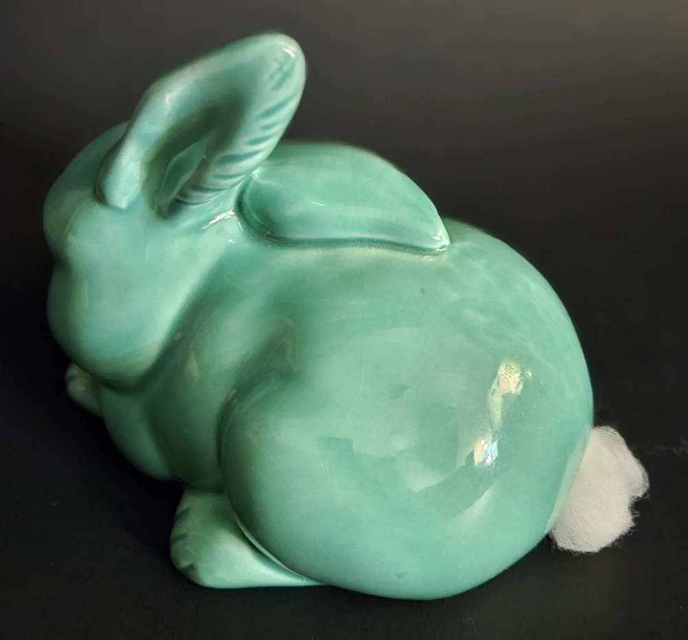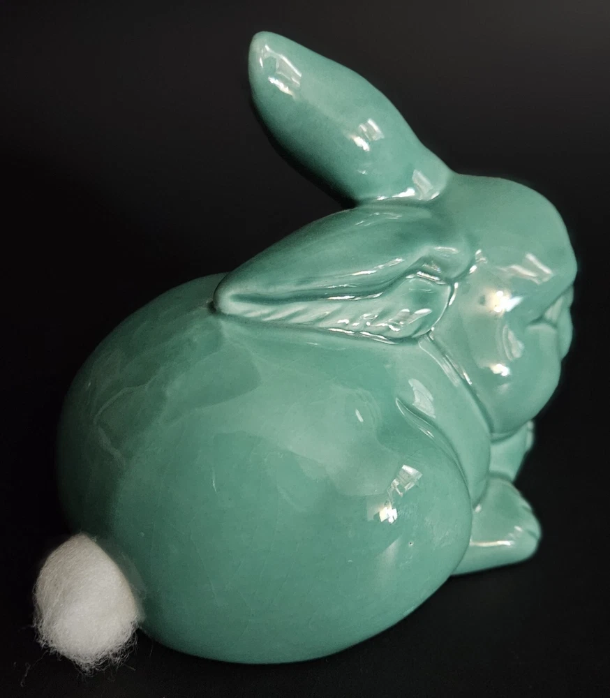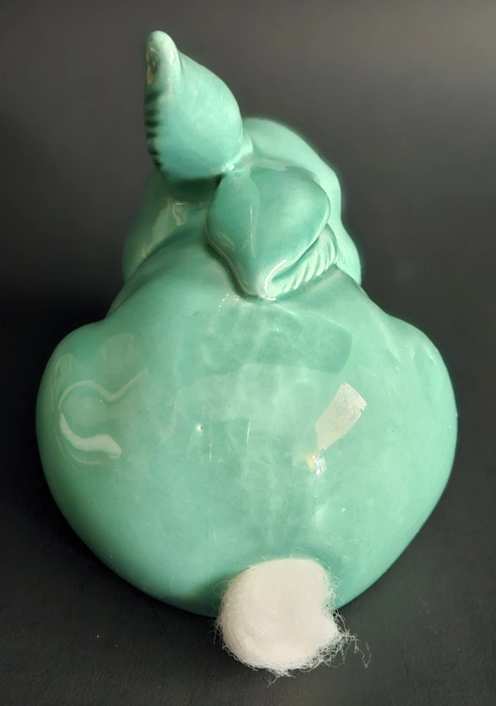 Vintage glazed ceramic bunny rabbit cotton ball dispensor. 4.25"T x 5"L. No chips, cracks or damage. Excellent condition.