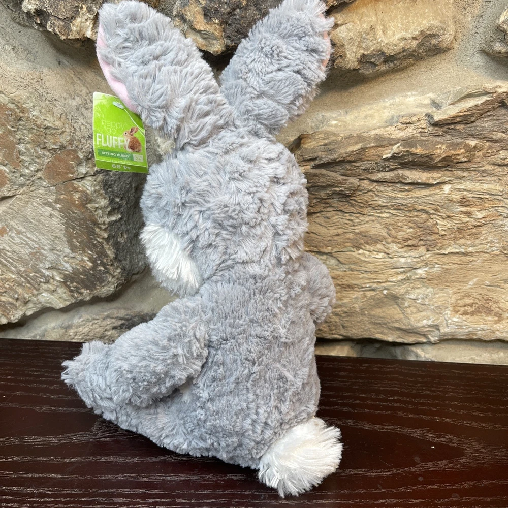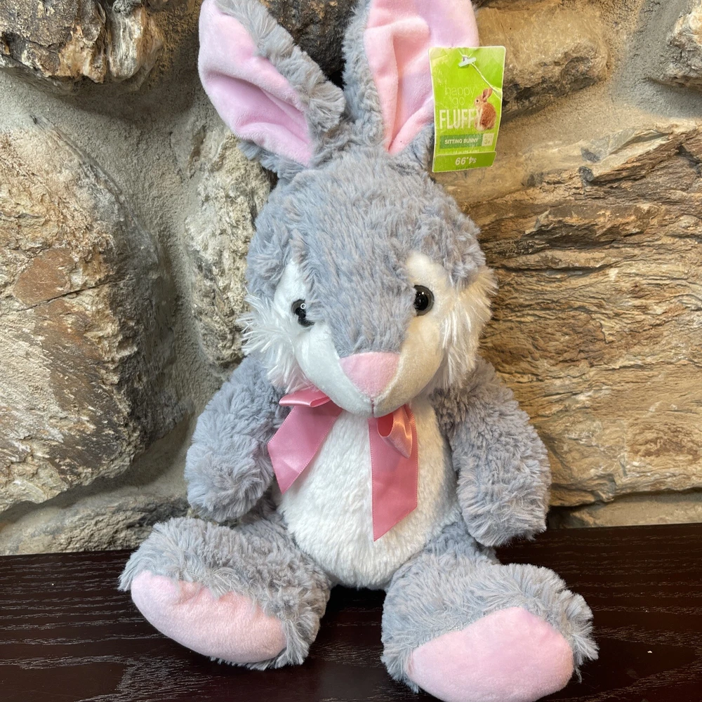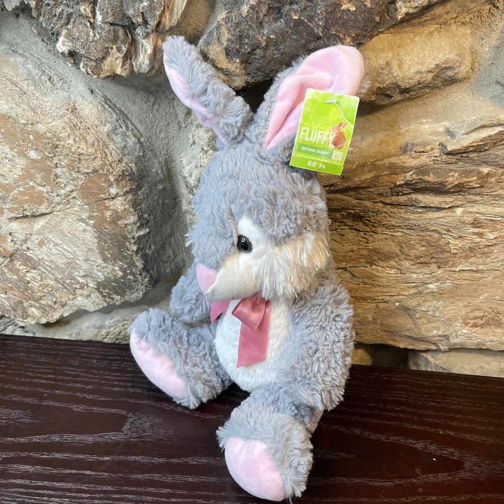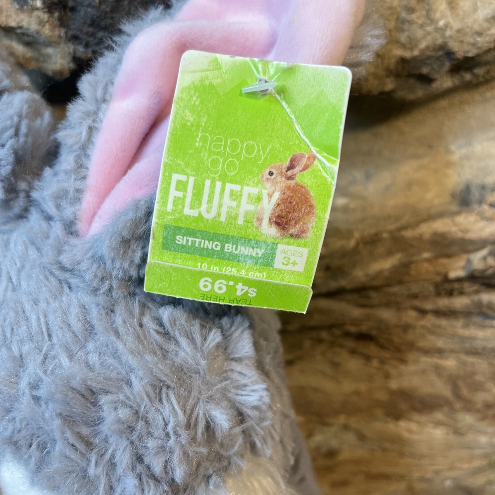 Bunny Rabbit Plush Happy Go Fluffy Gray Pink 13" Easter Bunny Walgreens New. The tag is slightly tattered- faded and crinkled. Shipped with USPS First Class