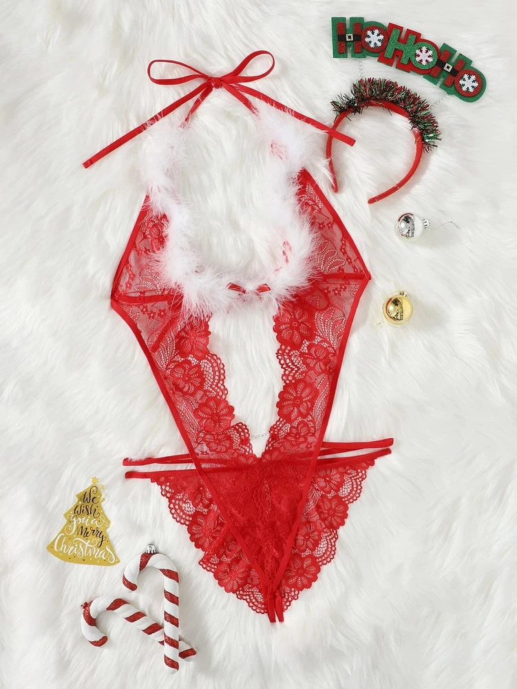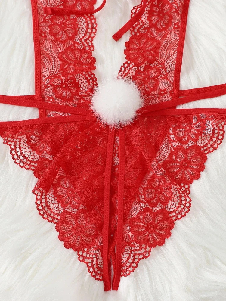 About this Item: 【Fabric】Mesh & Satin, Lace / Bright and Rich Red / Sheer / Beautiful white lace detailing and soft to the touch. Neck - Drawstring / Bra - Pull On closure Hand Wash Only 【Bra】Stretch Bralette / Adjustable Shoulder Straps / Unpadded / Unlined / Ties around the neck so you can adjust it to your height and chest size. 【Bottom】Thong / Irregular Cut Design / Made your booty looks bigger and waist looks smaller. 【Matching】Decorative Satin Ribbon Bow / Little Bell / Lace Ruffle / Little Fuzz Ball / Removable Mesh Bow 【Don't Miss】With some thigh high stockings and a sexy robe, made for a great Christmas wrapped look. 【Occasion:】For: a nice Christmas gift for your significant other, a Christmas themed photoshoot, great for spicing things up in the bedroom, honeymoon trip, Valentine’s day and heats up your night life. 【Package Content :】 1*Christmas Bodysuit