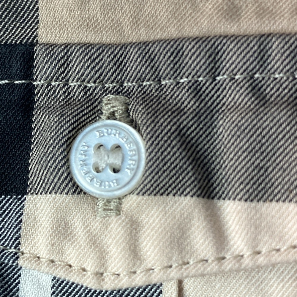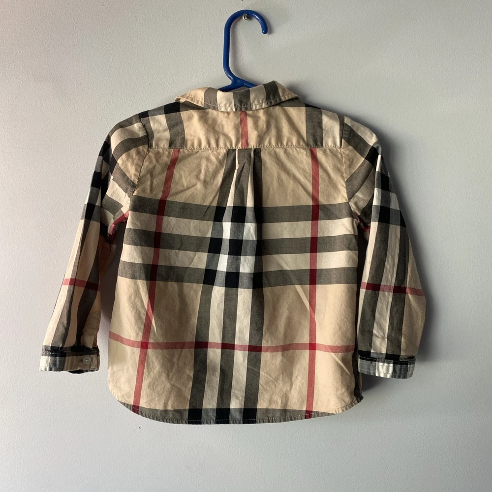 This Burberry toddler boys' shirt in size 2T features a tan long-sleeve design with a Nova check plaid pattern, made from 100% cotton for a comfortable fit. The collared neck with a button closure and regular fit make it a versatile option for various occasions such as travel, casual outings, parties, and more. The beige color and classic Burberry brand add a touch of sophistication to the overall preppy style. Perfect for all seasons, this button-up shirt is a timeless addition to any young boy's wardrobe.