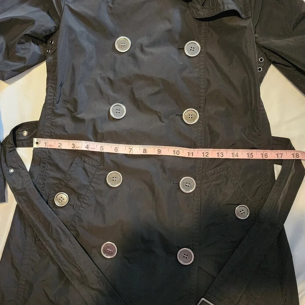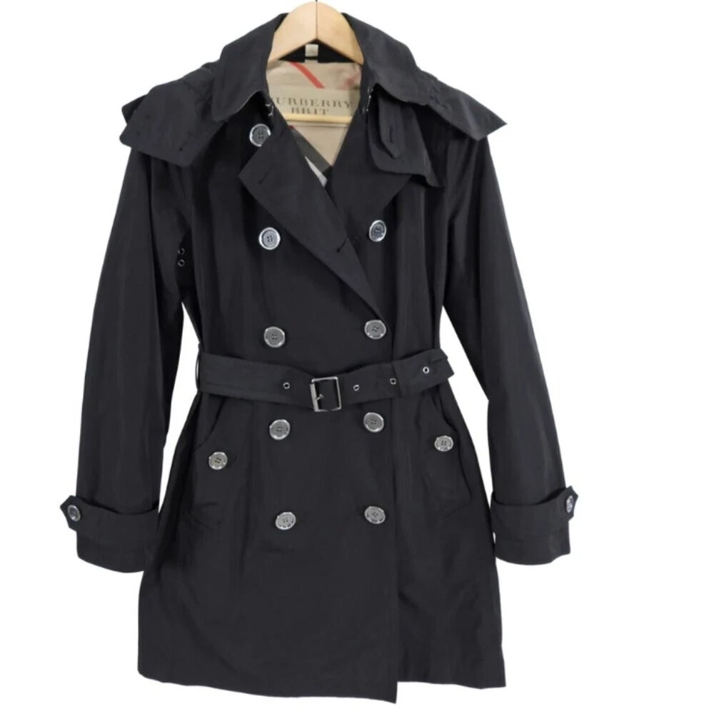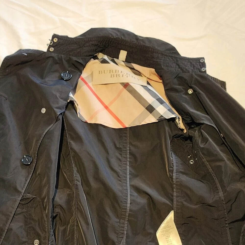 Black classic nylon trench coat with hood detail, dark gunmetal buttons, and classic Burberry check interior inset and collar lining. All buttons and other hardware is original and intact. Original belt and hood included. Was $1,500 new at Nordstroms. Clean and from a smoke-free home. Open to REASONABLE offers.